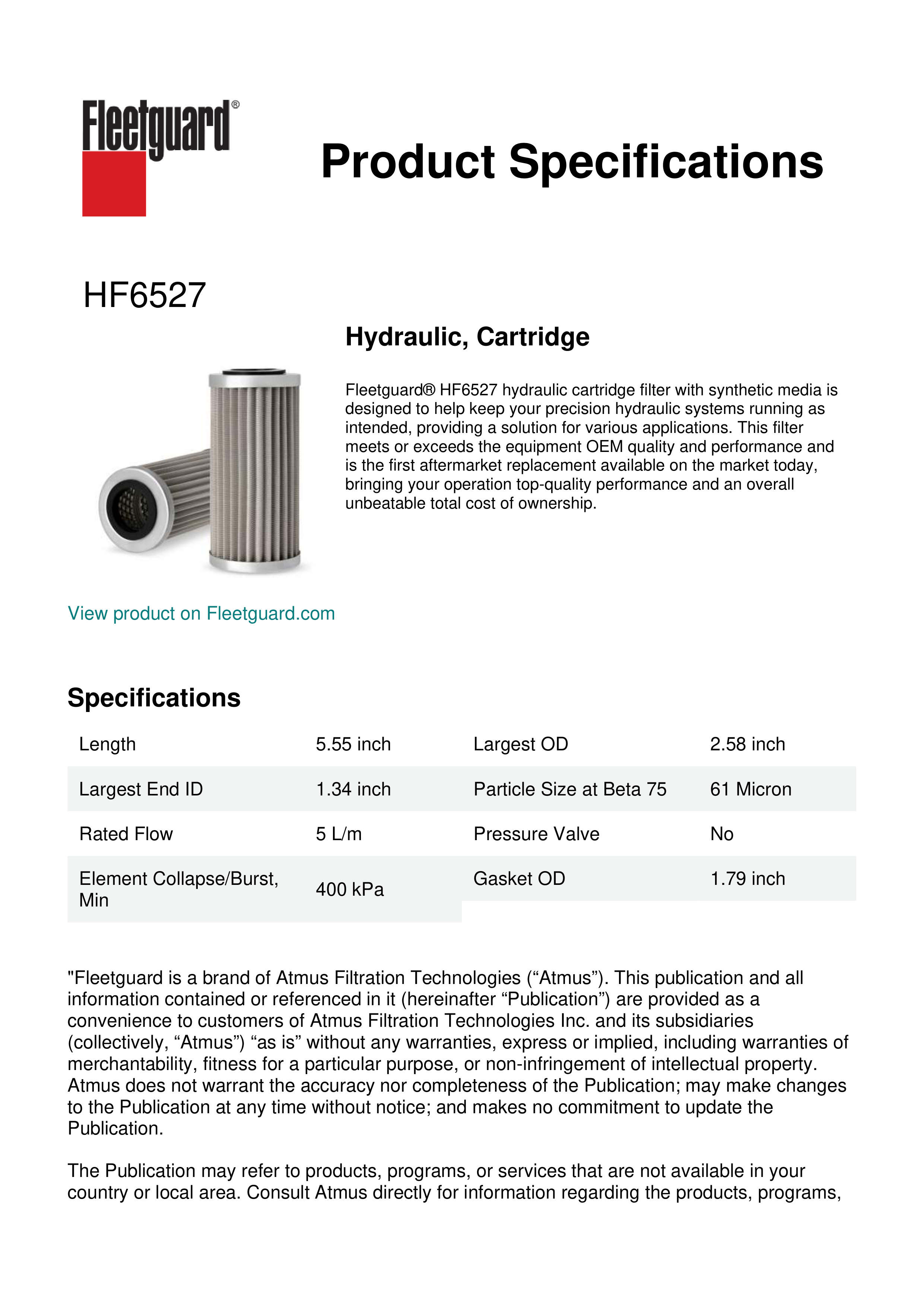 Fleetguard® HF6527 hydraulic cartridge filter with synthetic media is designed to help keep your precision hydraulic systems running as intended, providing a solution for various applications. This filter meets or exceeds the equipment OEM quality and performance and is the first aftermarket replacement available on the market today, bringing your operation top-quality performance and an overall unbeatable total cost of ownership.Specification