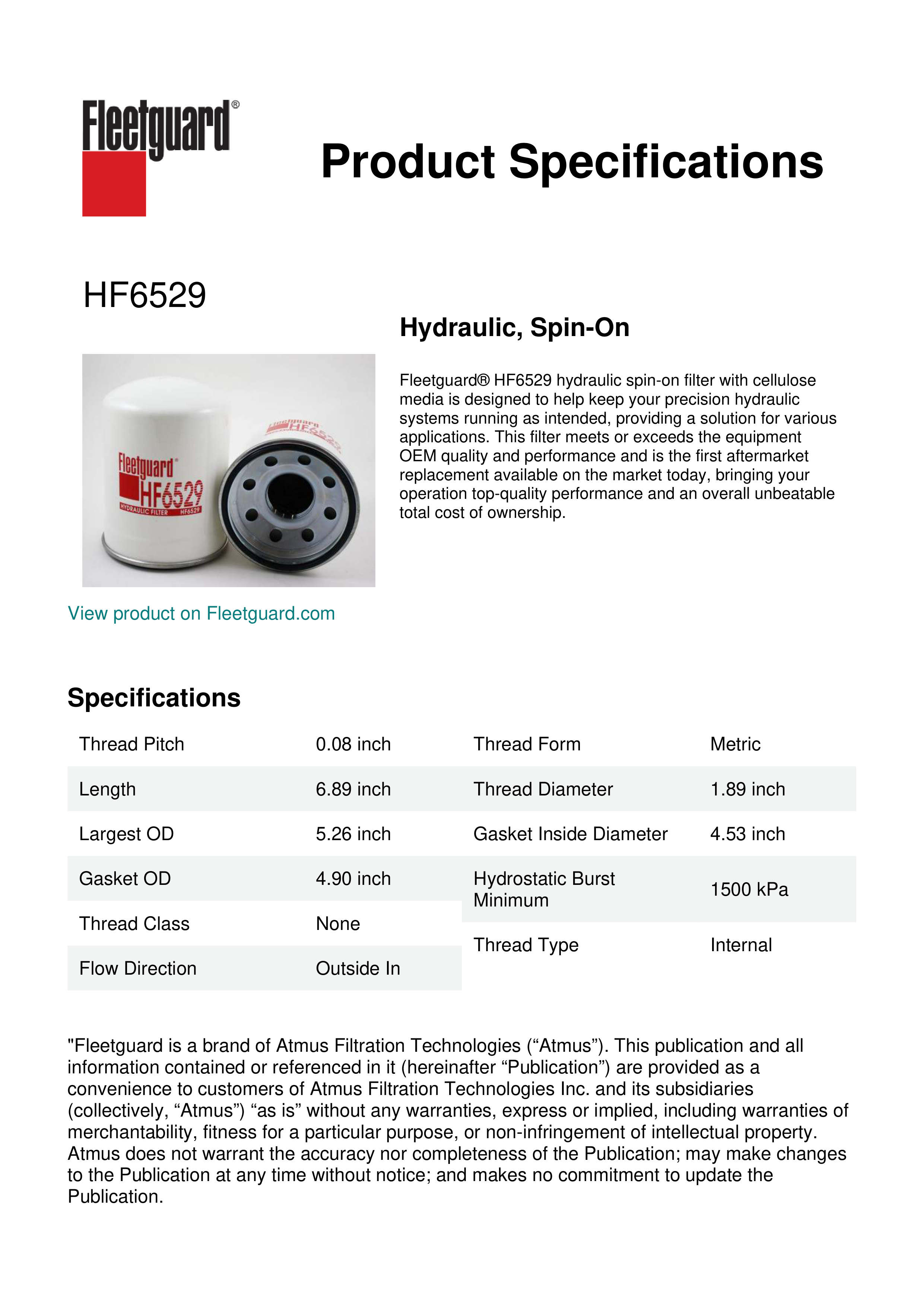 Fleetguard® HF6529 hydraulic spin-on filter with cellulose media is designed to help keep your precision hydraulic systems running as intended, providing a solution for various applications. This filter meets or exceeds the equipment OEM quality and performance and is the first aftermarket replacement available on the market today, bringing your operation top-quality performance and an overall unbeatable total cost of ownership.Specification
