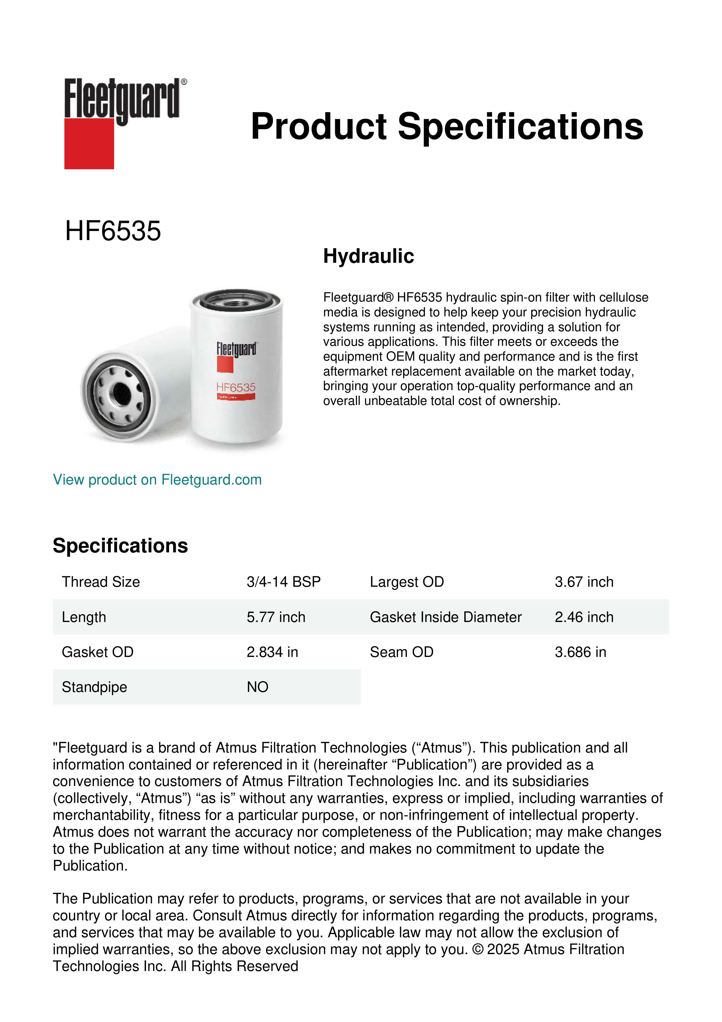 Fleetguard® HF6535 hydraulic spin-on filter with cellulose media is designed to help keep your precision hydraulic systems running as intended, providing a solution for various applications. This filter meets or exceeds the equipment OEM quality and performance and is the first aftermarket replacement available on the market today, bringing your operation top-quality performance and an overall unbeatable total cost of ownership.Specification