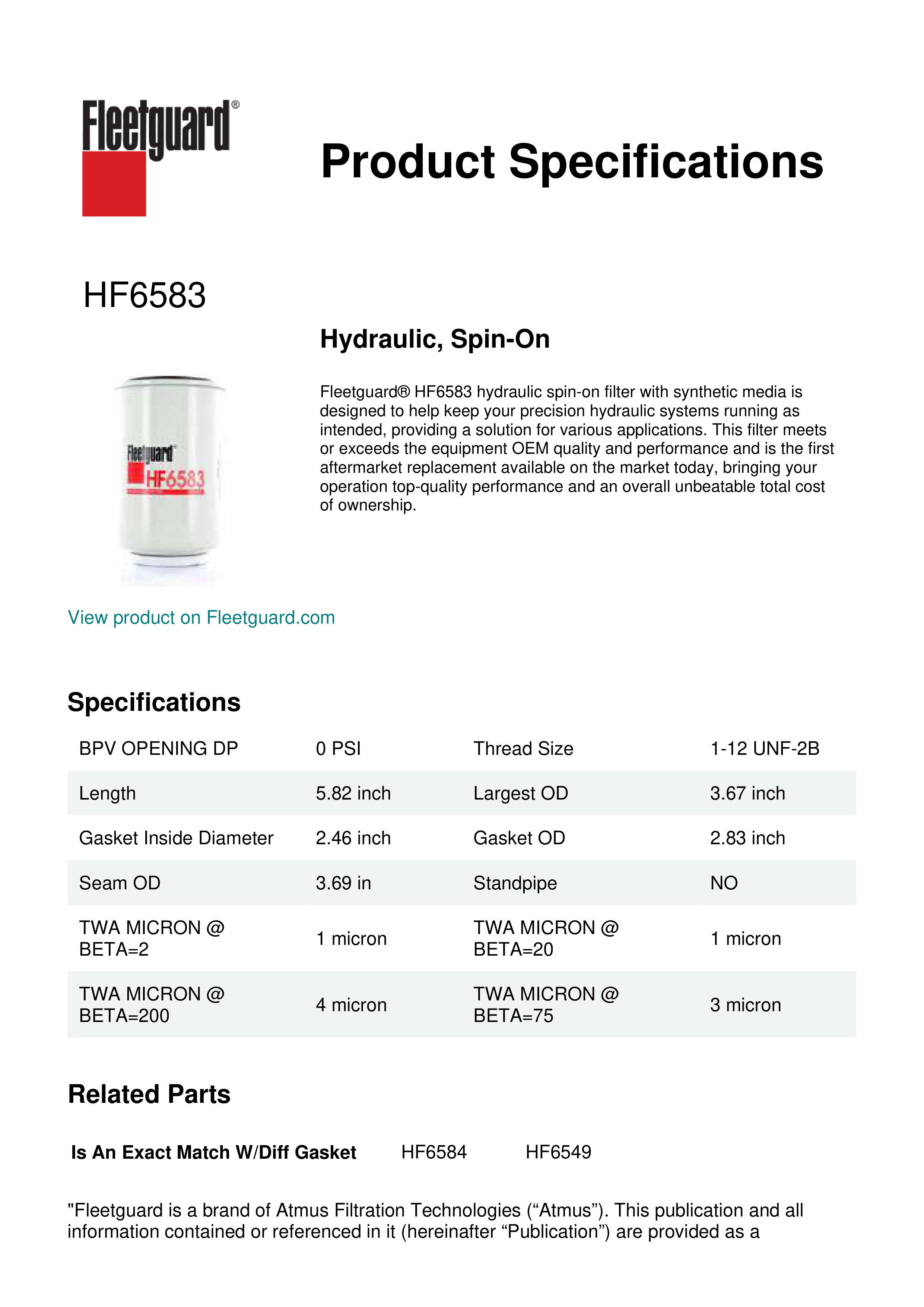 Fleetguard® HF6583 hydraulic spin-on filter with synthetic media is designed to help keep your precision hydraulic systems running as intended, providing a solution for various applications. This filter meets or exceeds the equipment OEM quality and performance and is the first aftermarket replacement available on the market today, bringing your operation top-quality performance and an overall unbeatable total cost of ownership.Specification