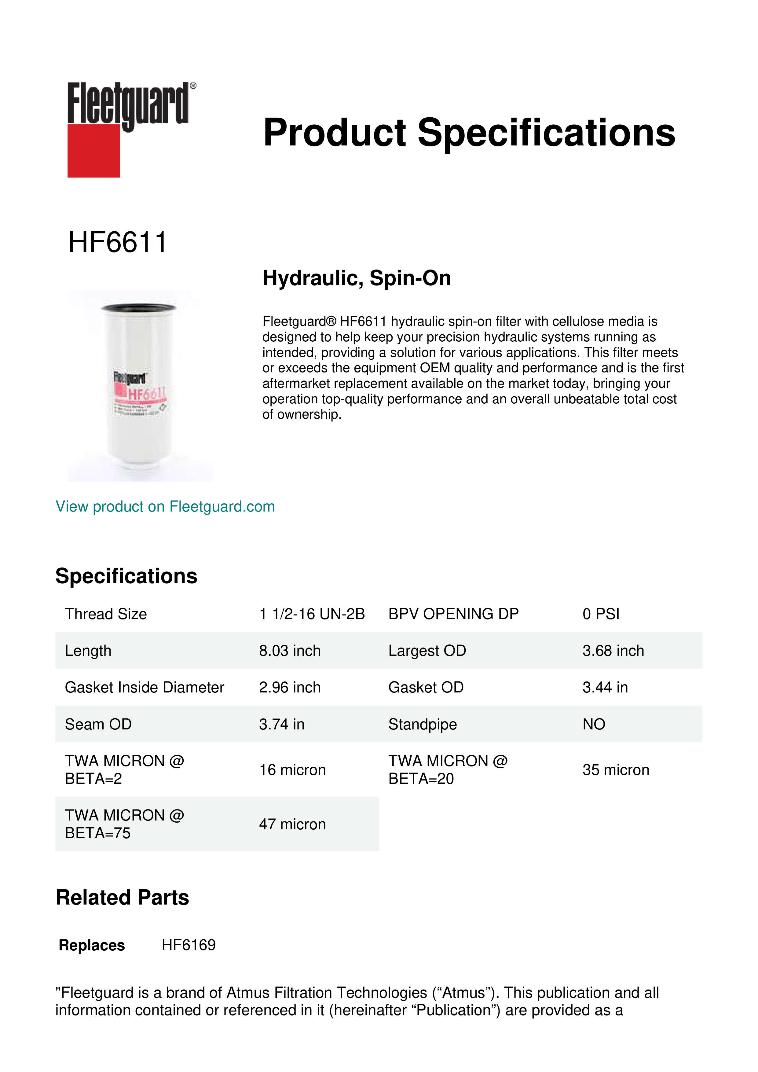 Fleetguard® HF6611 hydraulic spin-on filter with cellulose media is designed to help keep your precision hydraulic systems running as intended, providing a solution for various applications. This filter meets or exceeds the equipment OEM quality and performance and is the first aftermarket replacement available on the market today, bringing your operation top-quality performance and an overall unbeatable total cost of ownership.Specification