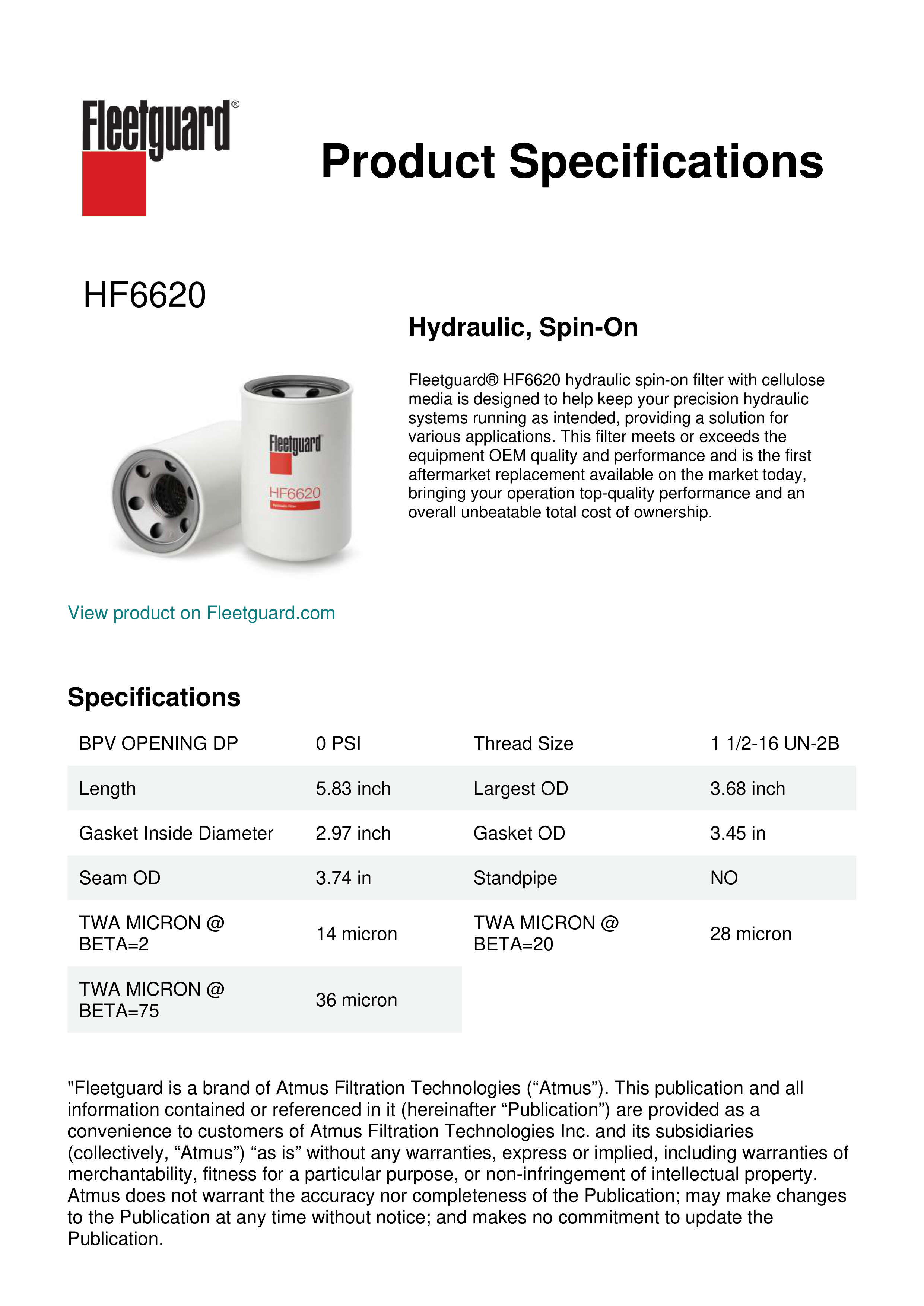Fleetguard® HF6620 hydraulic spin-on filter with cellulose media is designed to help keep your precision hydraulic systems running as intended, providing a solution for various applications. This filter meets or exceeds the equipment OEM quality and performance and is the first aftermarket replacement available on the market today, bringing your operation top-quality performance and an overall unbeatable total cost of ownership.Specification