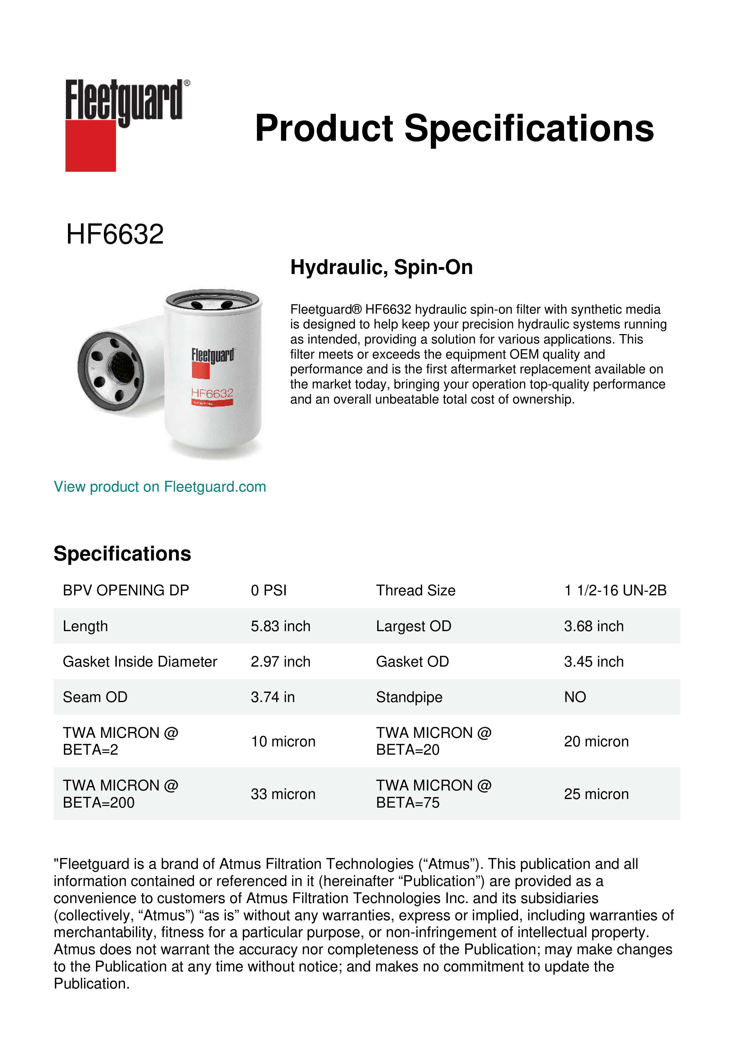 Fleetguard® HF6632 hydraulic spin-on filter with synthetic media is designed to help keep your precision hydraulic systems running as intended, providing a solution for various applications. This filter meets or exceeds the equipment OEM quality and performance and is the first aftermarket replacement available on the market today, bringing your operation top-quality performance and an overall unbeatable total cost of ownership.Specification
