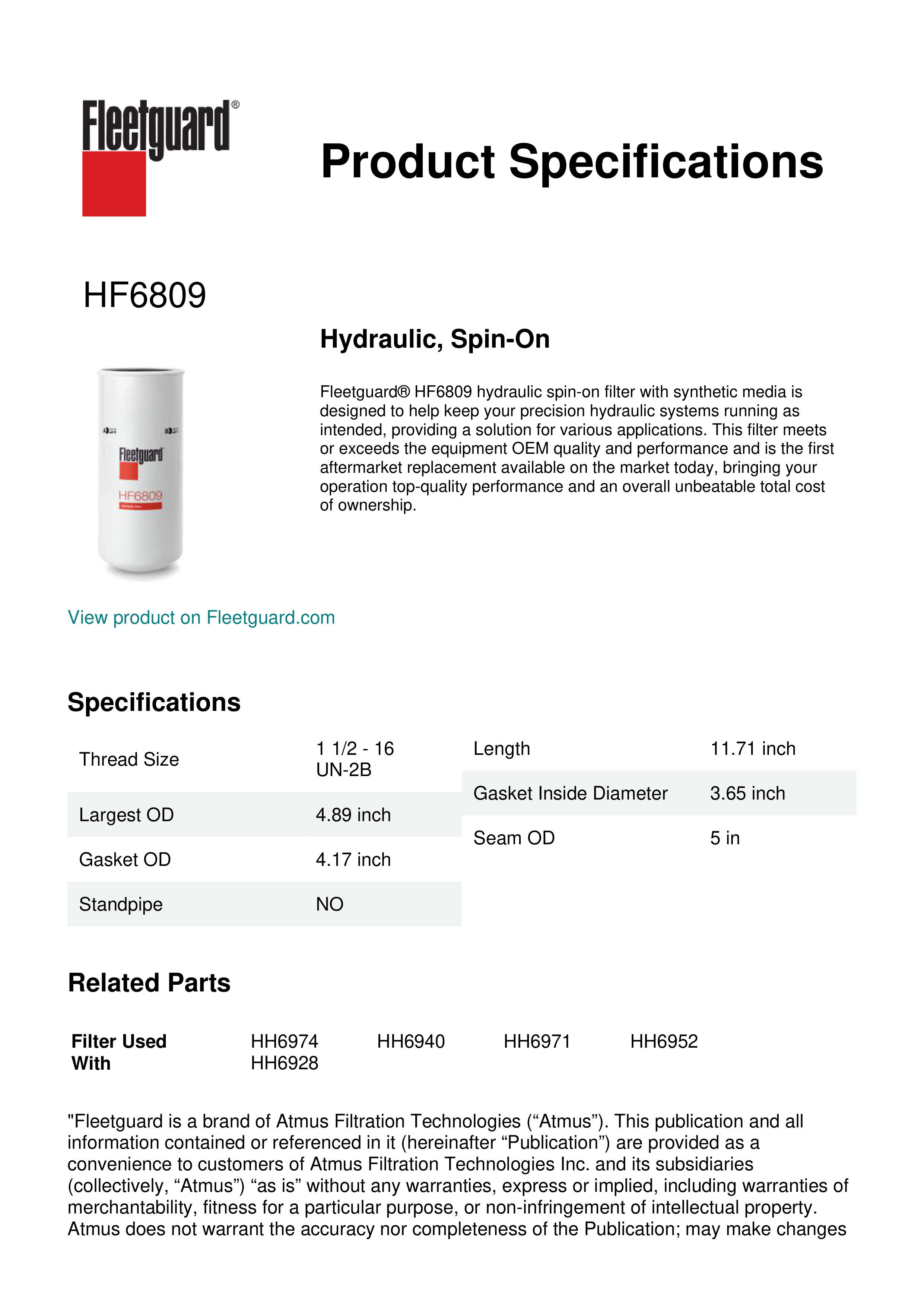 Fleetguard® HF6809 hydraulic spin-on filter with synthetic media is designed to help keep your precision hydraulic systems running as intended, providing a solution for various applications. This filter meets or exceeds the equipment OEM quality and performance and is the first aftermarket replacement available on the market today, bringing your operation top-quality performance and an overall unbeatable total cost of ownership.Specification