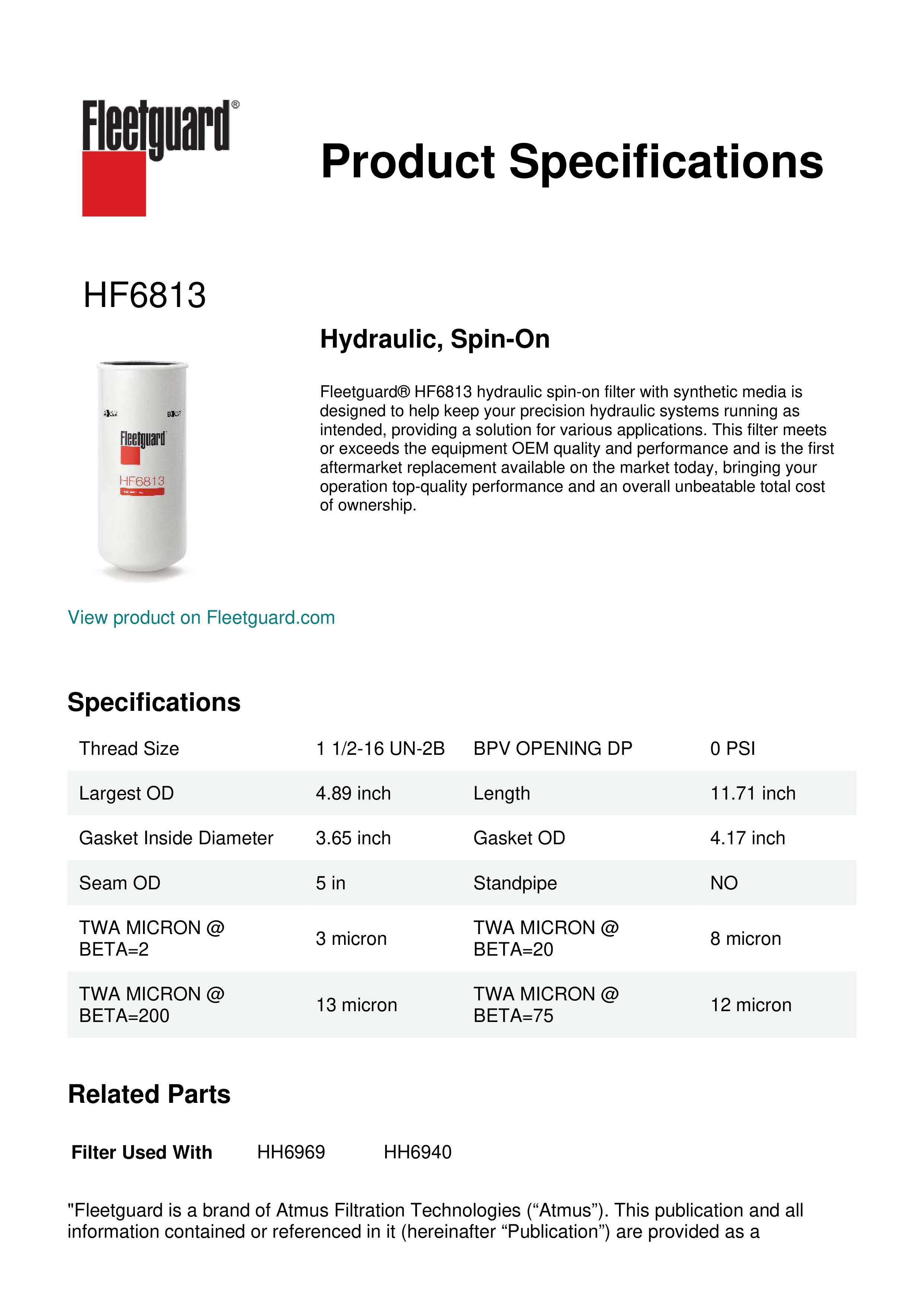 Fleetguard® HF6813 hydraulic spin-on filter with synthetic media is designed to help keep your precision hydraulic systems running as intended, providing a solution for various applications. This filter meets or exceeds the equipment OEM quality and performance and is the first aftermarket replacement available on the market today, bringing your operation top-quality performance and an overall unbeatable total cost of ownership.Specification