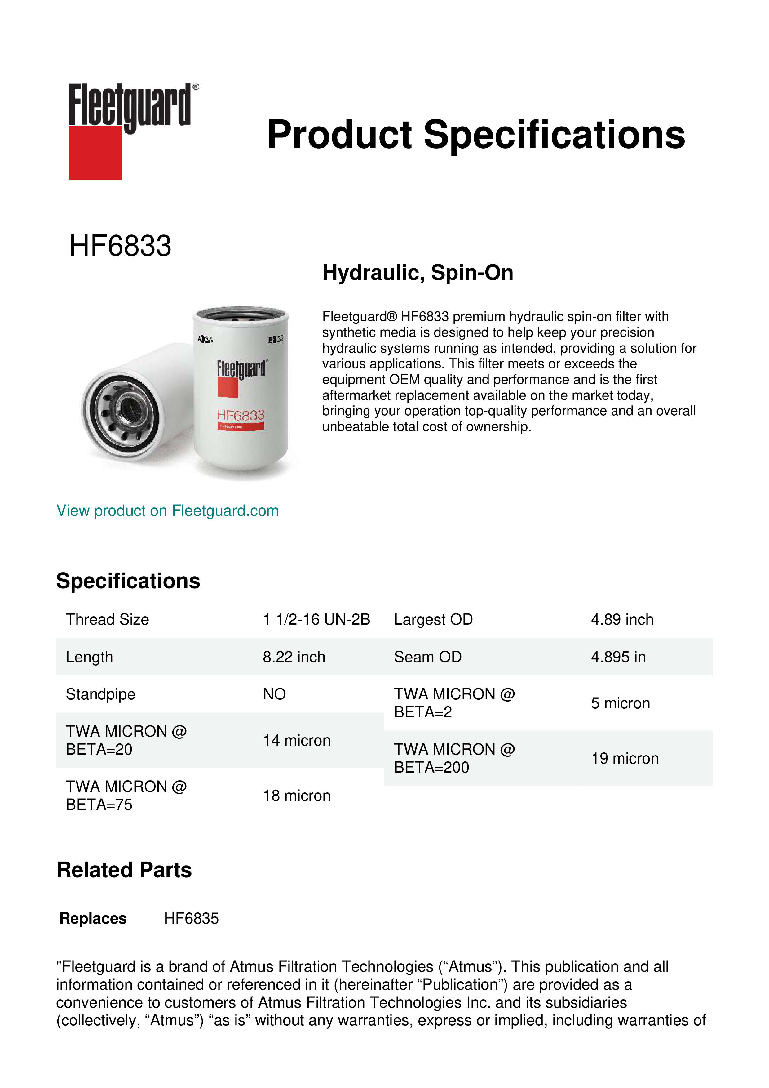 Fleetguard® HF6833 premium hydraulic spin-on filter with synthetic media is designed to help keep your precision hydraulic systems running as intended, providing a solution for various applications. This filter meets or exceeds the equipment OEM quality and performance and is the first aftermarket replacement available on the market today, bringing your operation top-quality performance and an overall unbeatable total cost of ownership.Specification