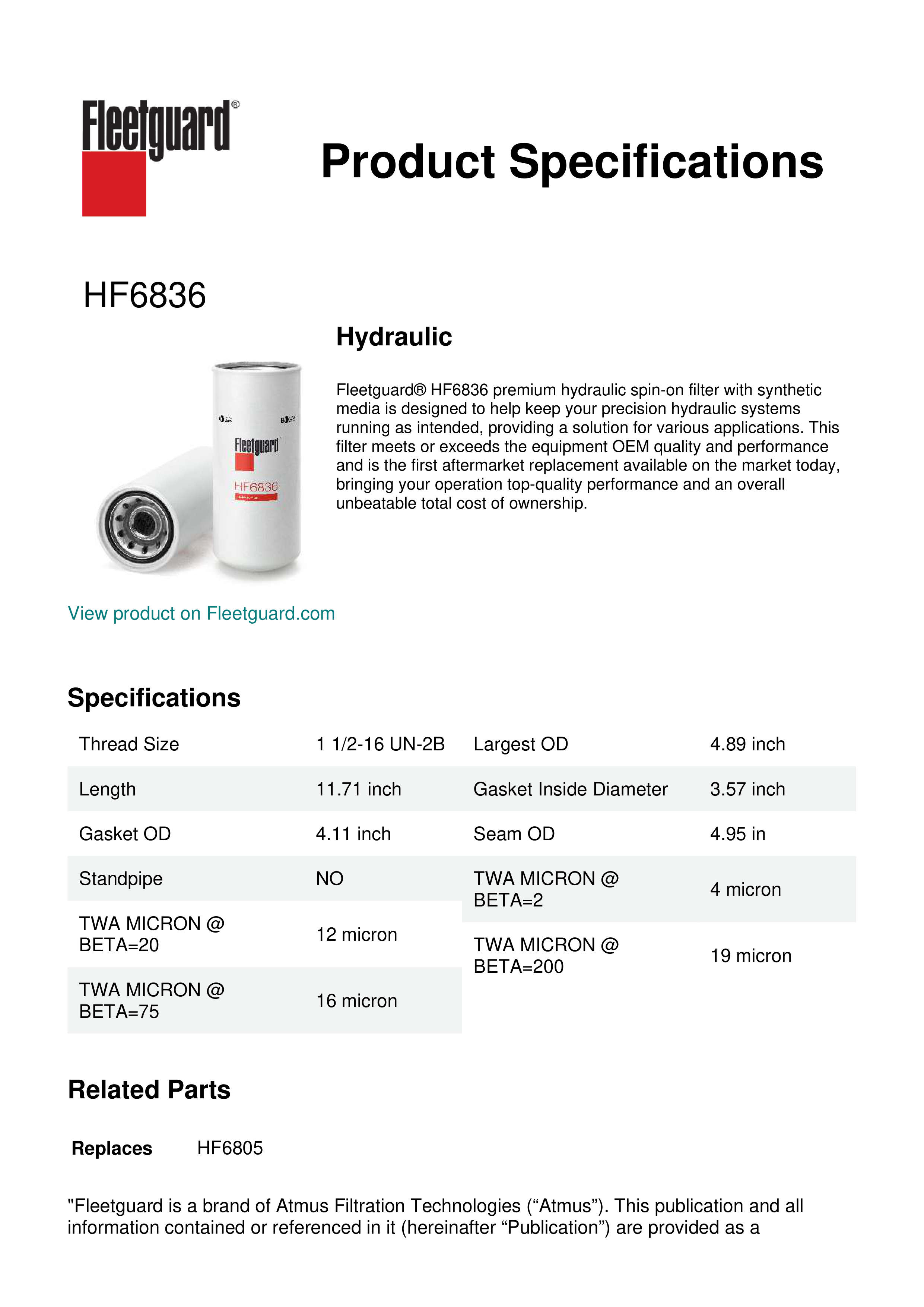 Fleetguard® HF6836 premium hydraulic spin-on filter with synthetic media is designed to help keep your precision hydraulic systems running as intended, providing a solution for various applications. This filter meets or exceeds the equipment OEM quality and performance and is the first aftermarket replacement available on the market today, bringing your operation top-quality performance and an overall unbeatable total cost of ownership.Specification
