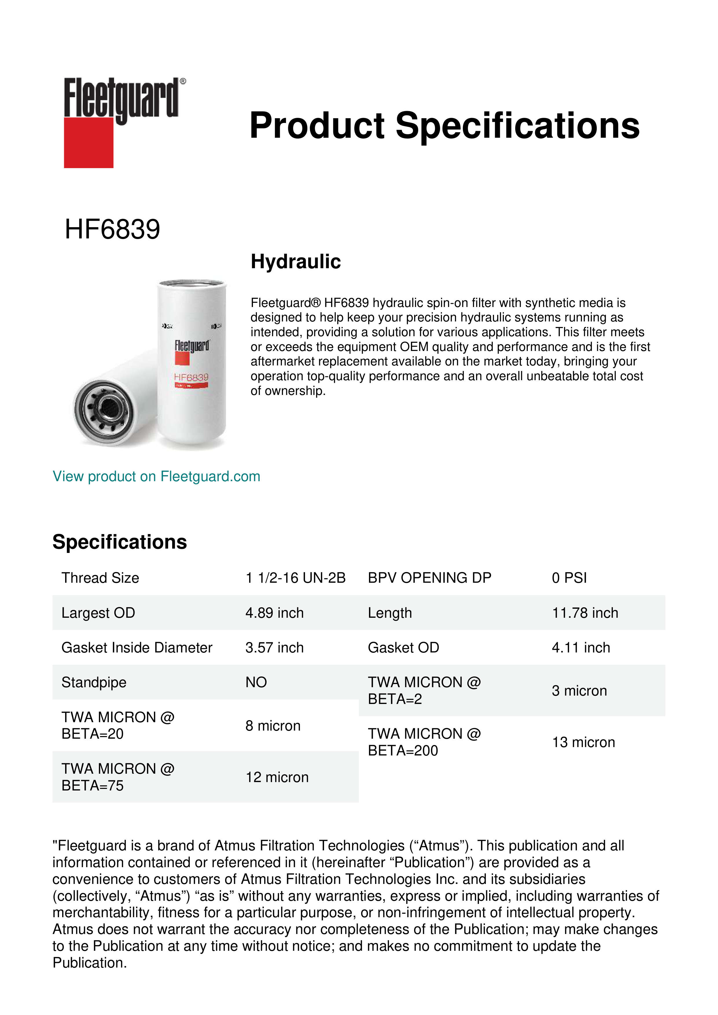 Fleetguard® HF6839 hydraulic spin-on filter with synthetic media is designed to help keep your precision hydraulic systems running as intended, providing a solution for various applications. This filter meets or exceeds the equipment OEM quality and performance and is the first aftermarket replacement available on the market today, bringing your operation top-quality performance and an overall unbeatable total cost of ownership.Specification