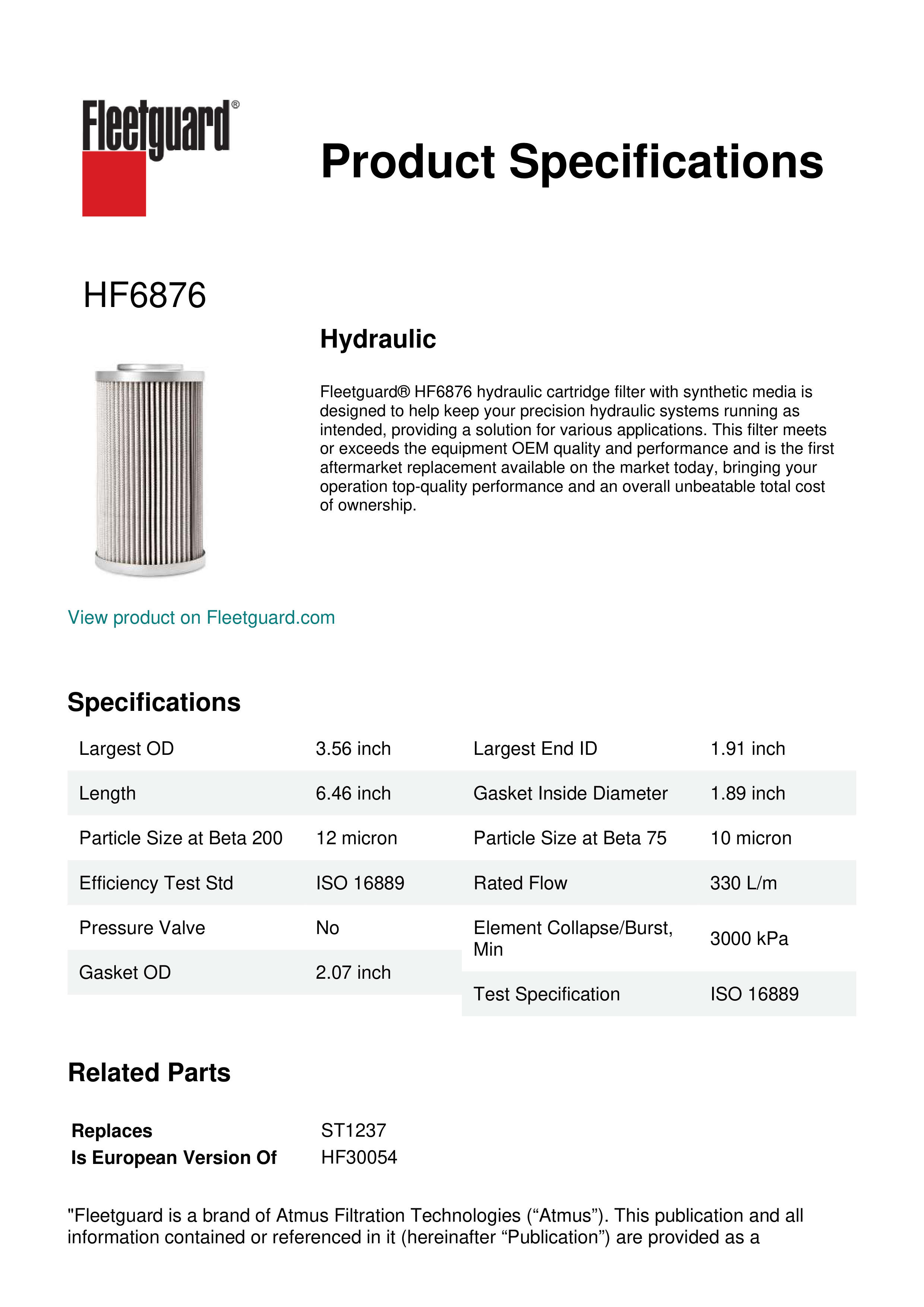 Fleetguard® HF6876 hydraulic cartridge filter with synthetic media is designed to help keep your precision hydraulic systems running as intended, providing a solution for various applications. This filter meets or exceeds the equipment OEM quality and performance and is the first aftermarket replacement available on the market today, bringing your operation top-quality performance and an overall unbeatable total cost of ownership.Specification