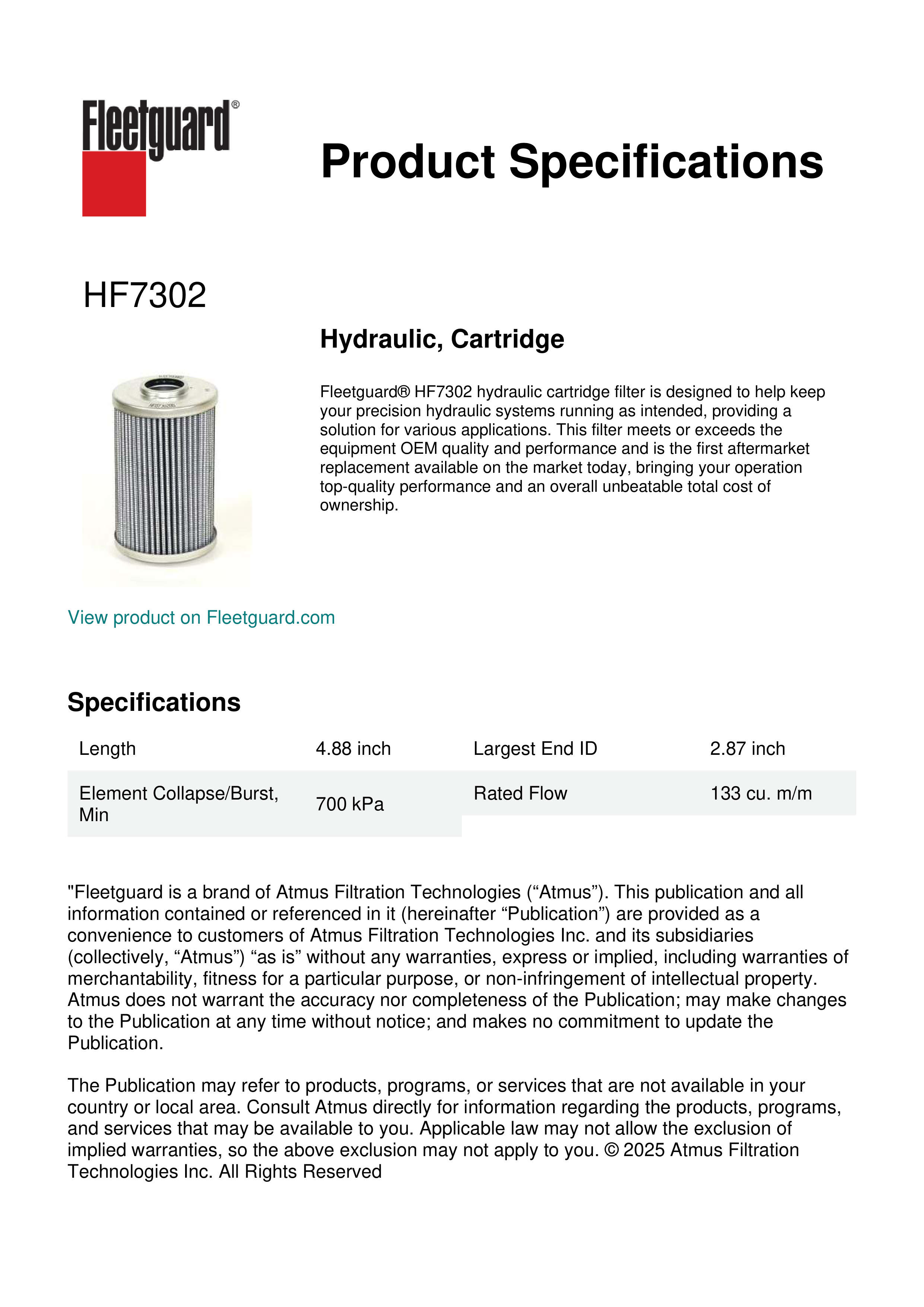 Fleetguard® HF7302 hydraulic cartridge filter is designed to help keep your precision hydraulic systems running as intended, providing a solution for various applications. This filter meets or exceeds the equipment OEM quality and performance and is the first aftermarket replacement available on the market today, bringing your operation top-quality performance and an overall unbeatable total cost of ownership.Specification