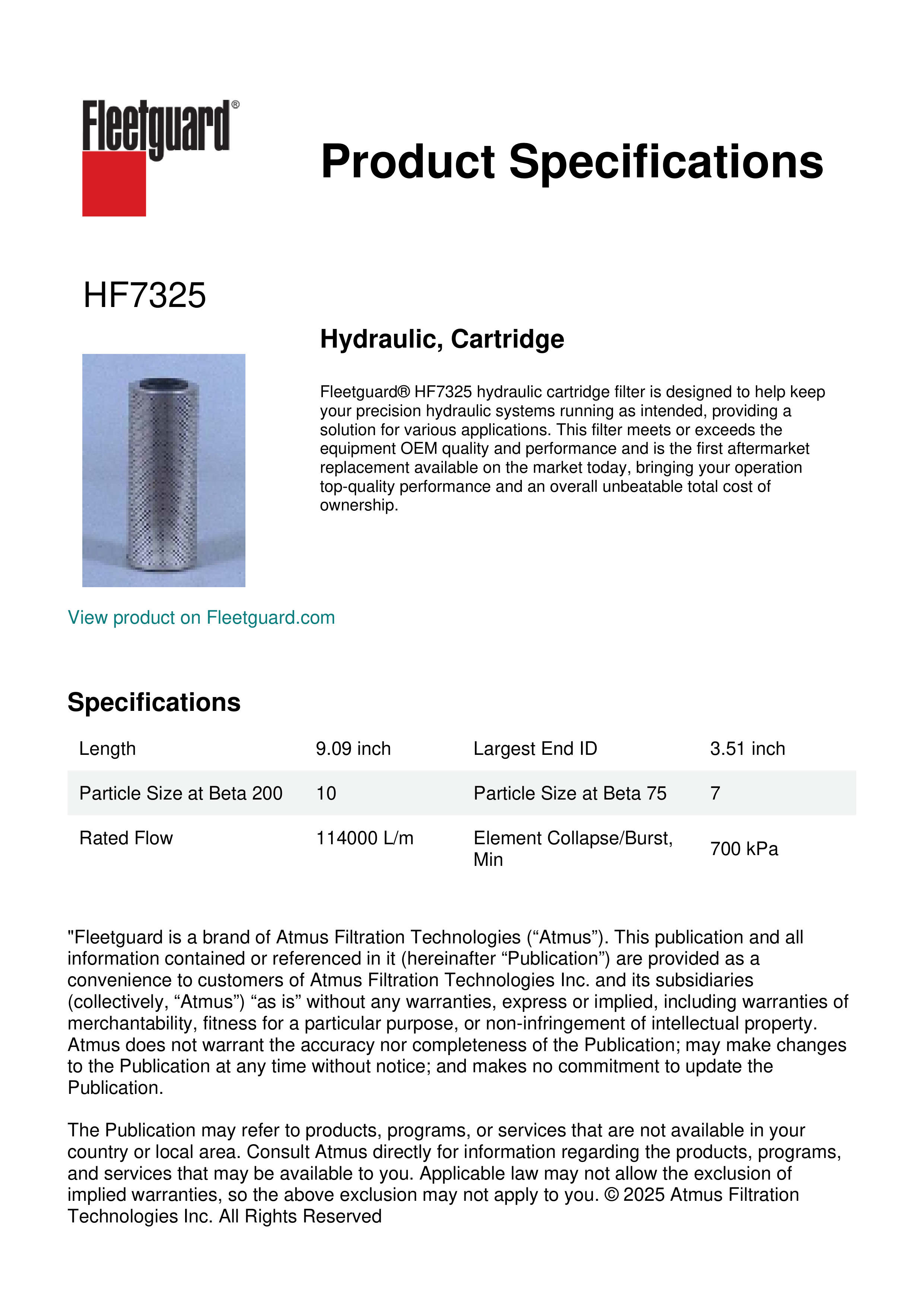 Fleetguard® HF7325 hydraulic cartridge filter is designed to help keep your precision hydraulic systems running as intended, providing a solution for various applications. This filter meets or exceeds the equipment OEM quality and performance and is the first aftermarket replacement available on the market today, bringing your operation top-quality performance and an overall unbeatable total cost of ownership.Specification