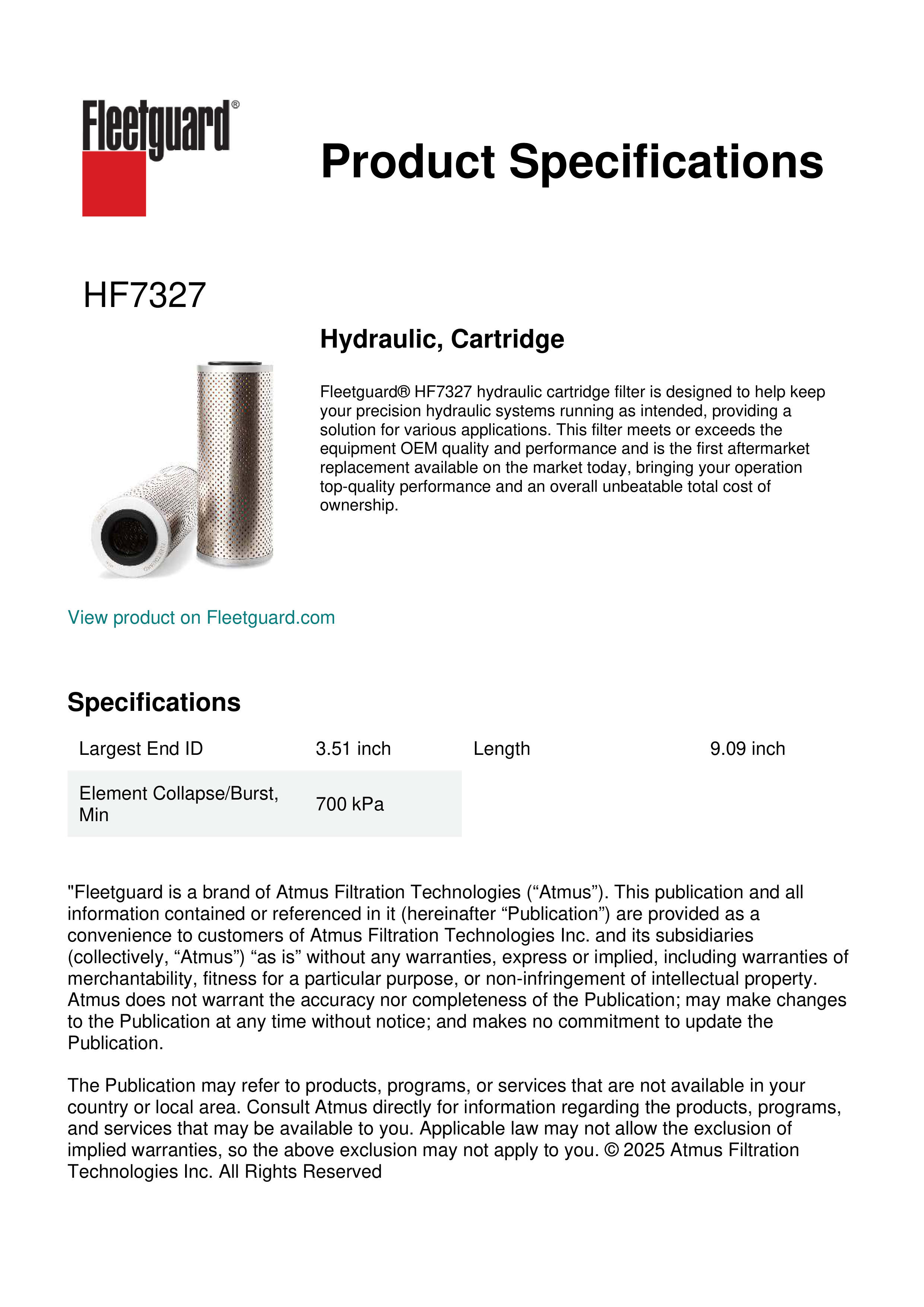 Fleetguard® HF7327 hydraulic cartridge filter is designed to help keep your precision hydraulic systems running as intended, providing a solution for various applications. This filter meets or exceeds the equipment OEM quality and performance and is the first aftermarket replacement available on the market today, bringing your operation top-quality performance and an overall unbeatable total cost of ownership.Specification