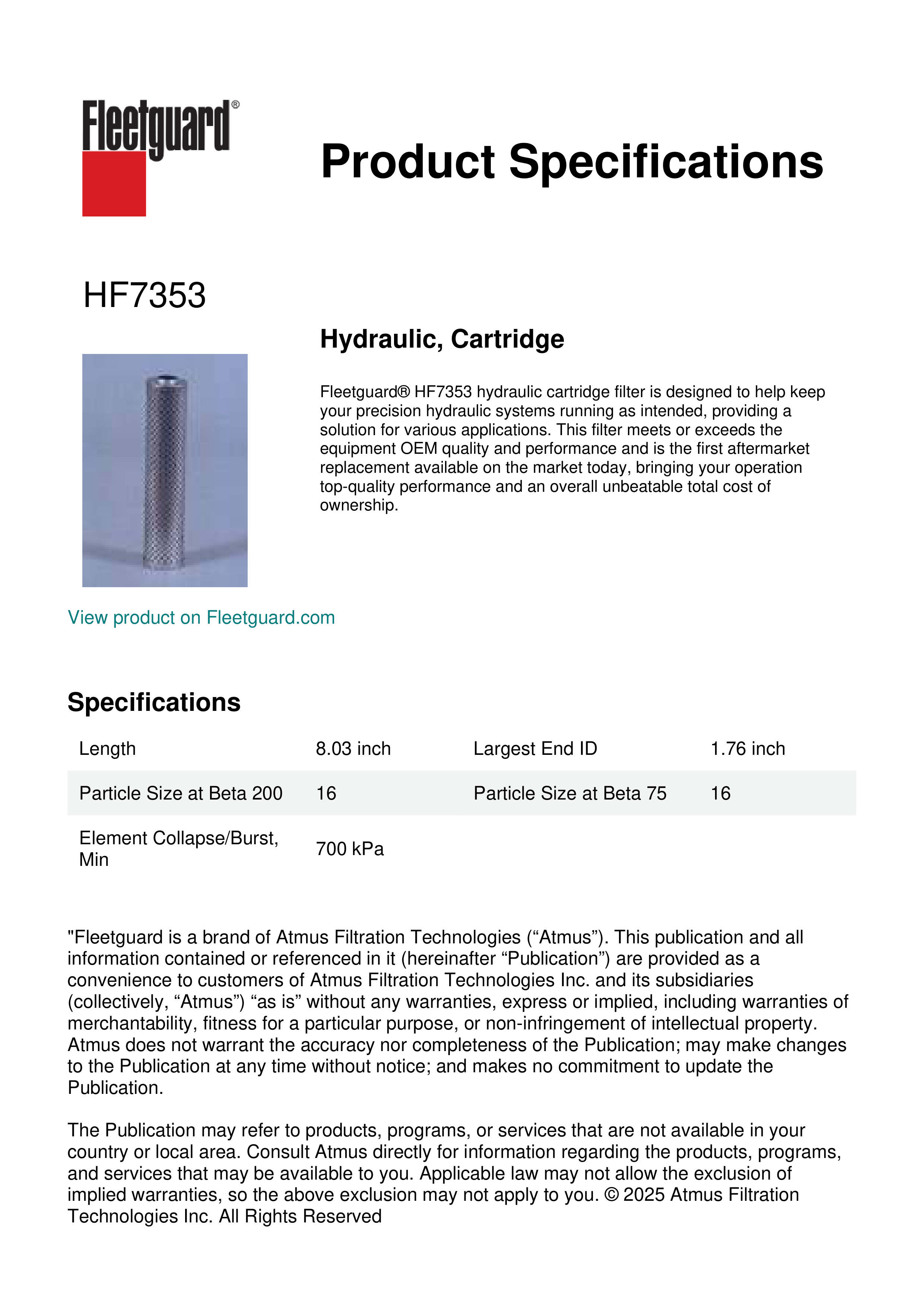 Fleetguard® HF7353 hydraulic cartridge filter is designed to help keep your precision hydraulic systems running as intended, providing a solution for various applications. This filter meets or exceeds the equipment OEM quality and performance and is the first aftermarket replacement available on the market today, bringing your operation top-quality performance and an overall unbeatable total cost of ownership.Specification