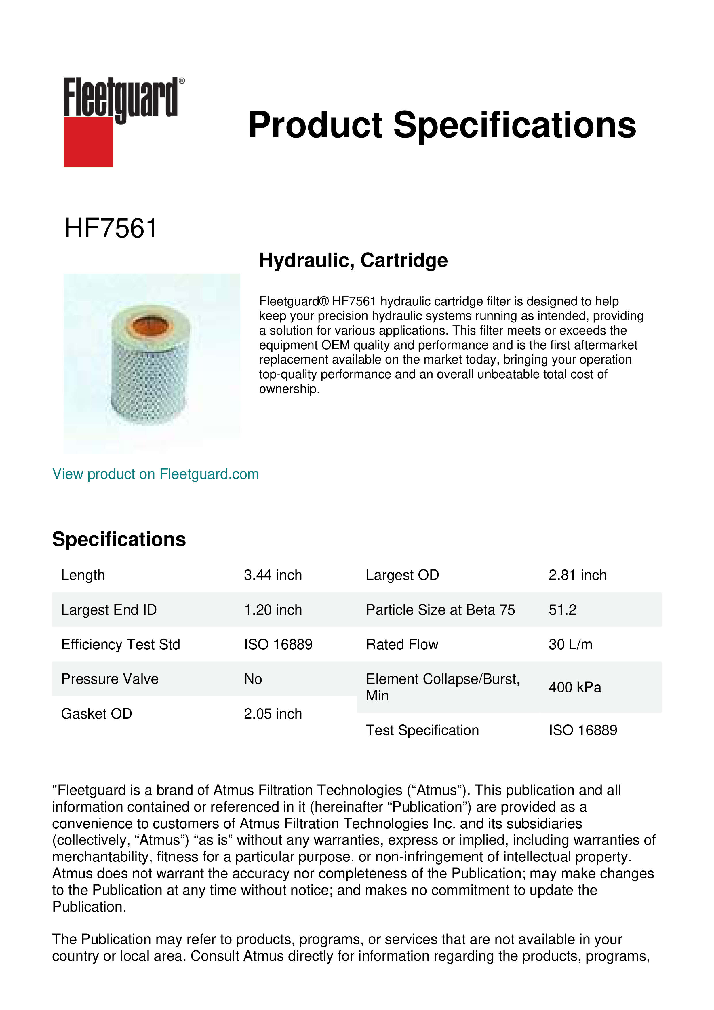 Fleetguard® HF7561 hydraulic cartridge filter is designed to help keep your precision hydraulic systems running as intended, providing a solution for various applications. This filter meets or exceeds the equipment OEM quality and performance and is the first aftermarket replacement available on the market today, bringing your operation top-quality performance and an overall unbeatable total cost of ownership.Specification