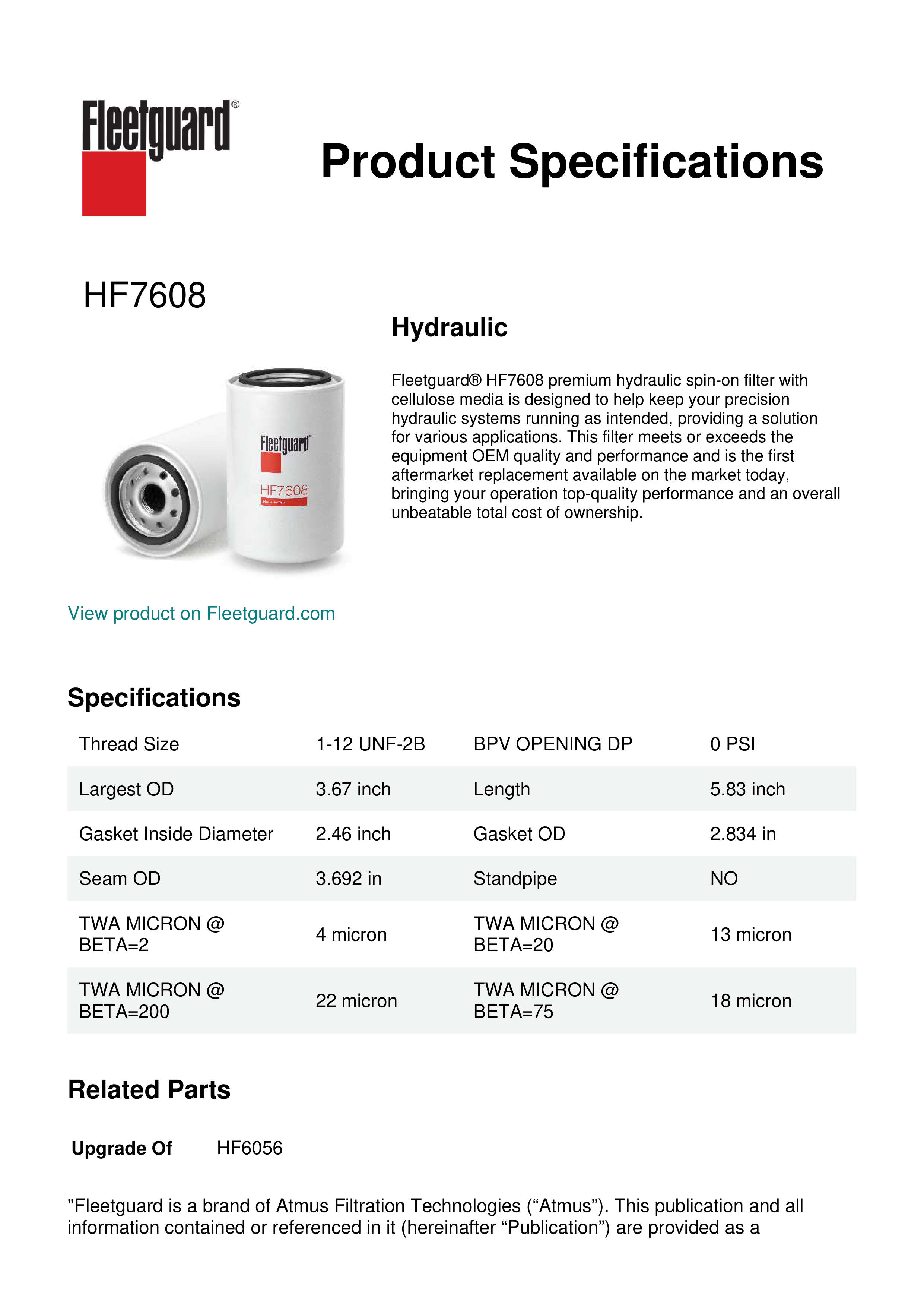 Fleetguard® HF7608 premium hydraulic spin-on filter with cellulose media is designed to help keep your precision hydraulic systems running as intended, providing a solution for various applications. This filter meets or exceeds the equipment OEM quality and performance and is the first aftermarket replacement available on the market today, bringing your operation top-quality performance and an overall unbeatable total cost of ownership.Specification