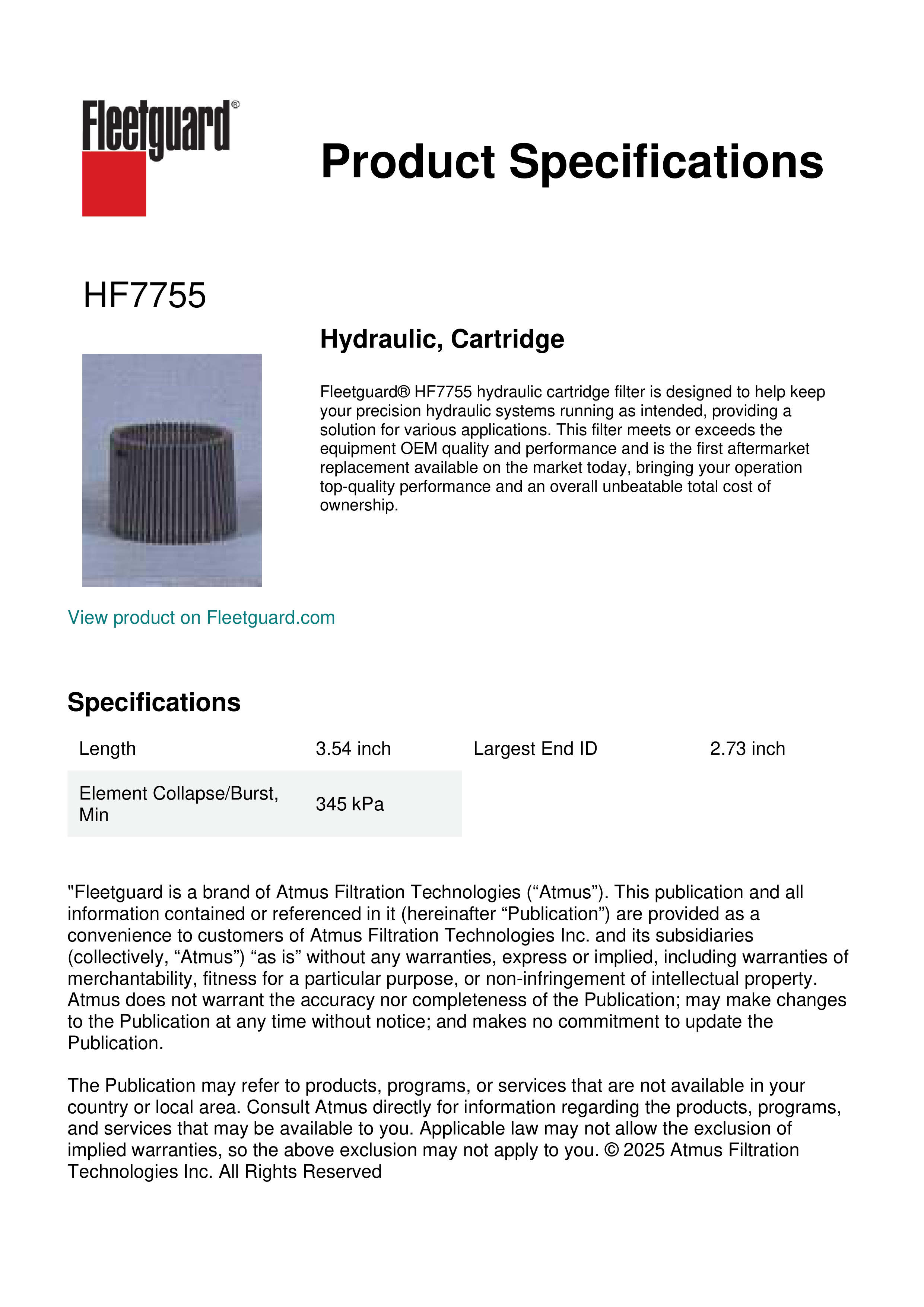 Fleetguard® HF7755 hydraulic cartridge filter is designed to help keep your precision hydraulic systems running as intended, providing a solution for various applications. This filter meets or exceeds the equipment OEM quality and performance and is the first aftermarket replacement available on the market today, bringing your operation top-quality performance and an overall unbeatable total cost of ownership.Specification
