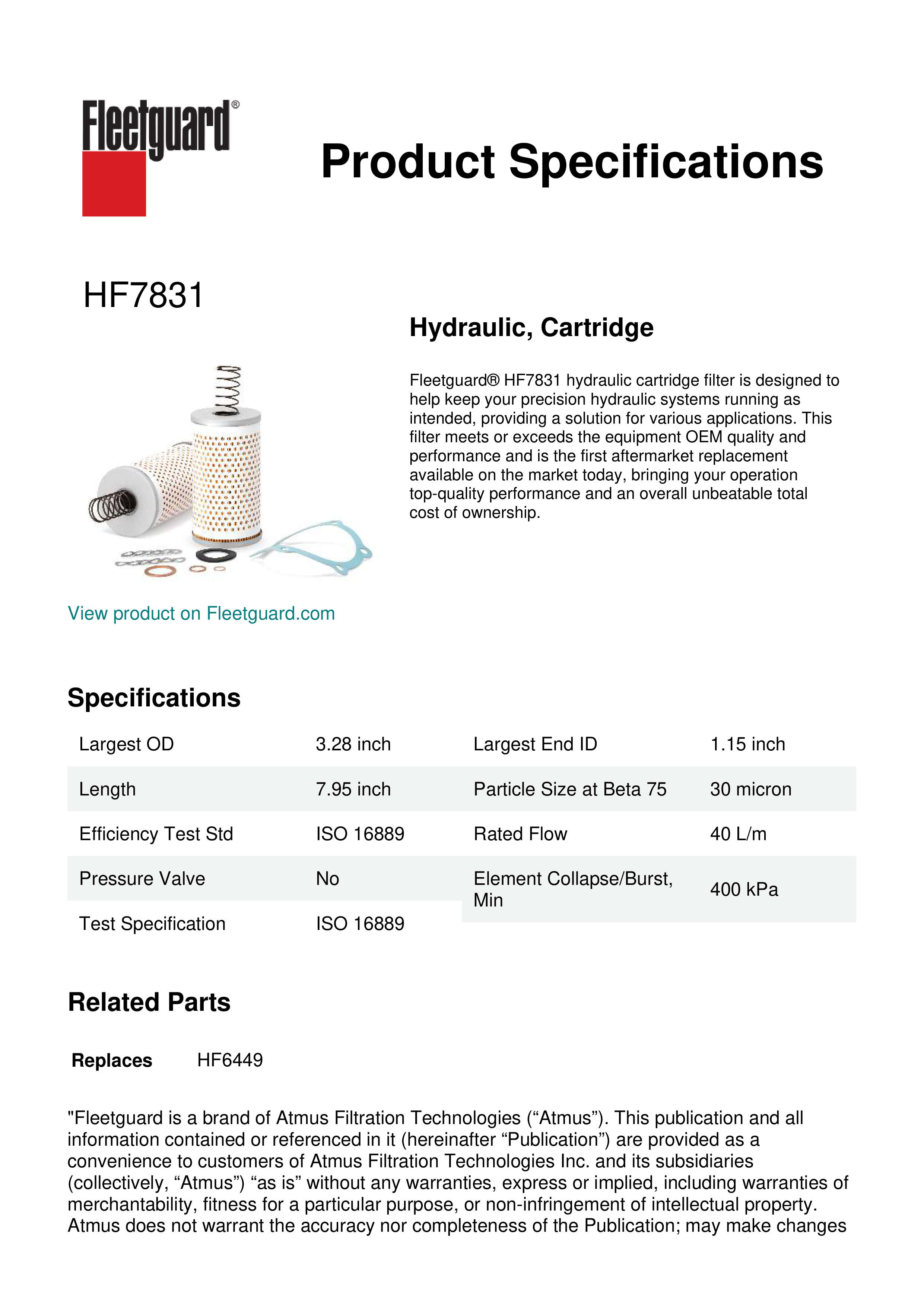 Fleetguard® HF7831 hydraulic cartridge filter is designed to help keep your precision hydraulic systems running as intended, providing a solution for various applications. This filter meets or exceeds the equipment OEM quality and performance and is the first aftermarket replacement available on the market today, bringing your operation top-quality performance and an overall unbeatable total cost of ownership.Specification