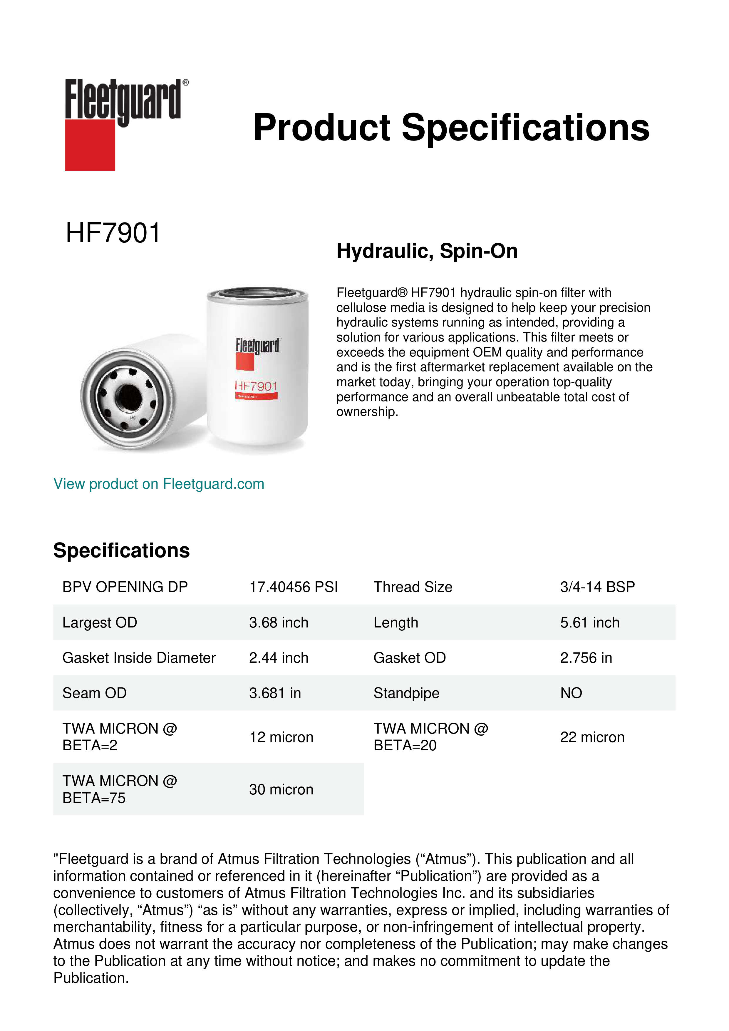 Fleetguard® HF7901 hydraulic spin-on filter with cellulose media is designed to help keep your precision hydraulic systems running as intended, providing a solution for various applications. This filter meets or exceeds the equipment OEM quality and performance and is the first aftermarket replacement available on the market today, bringing your operation top-quality performance and an overall unbeatable total cost of ownership.Specification