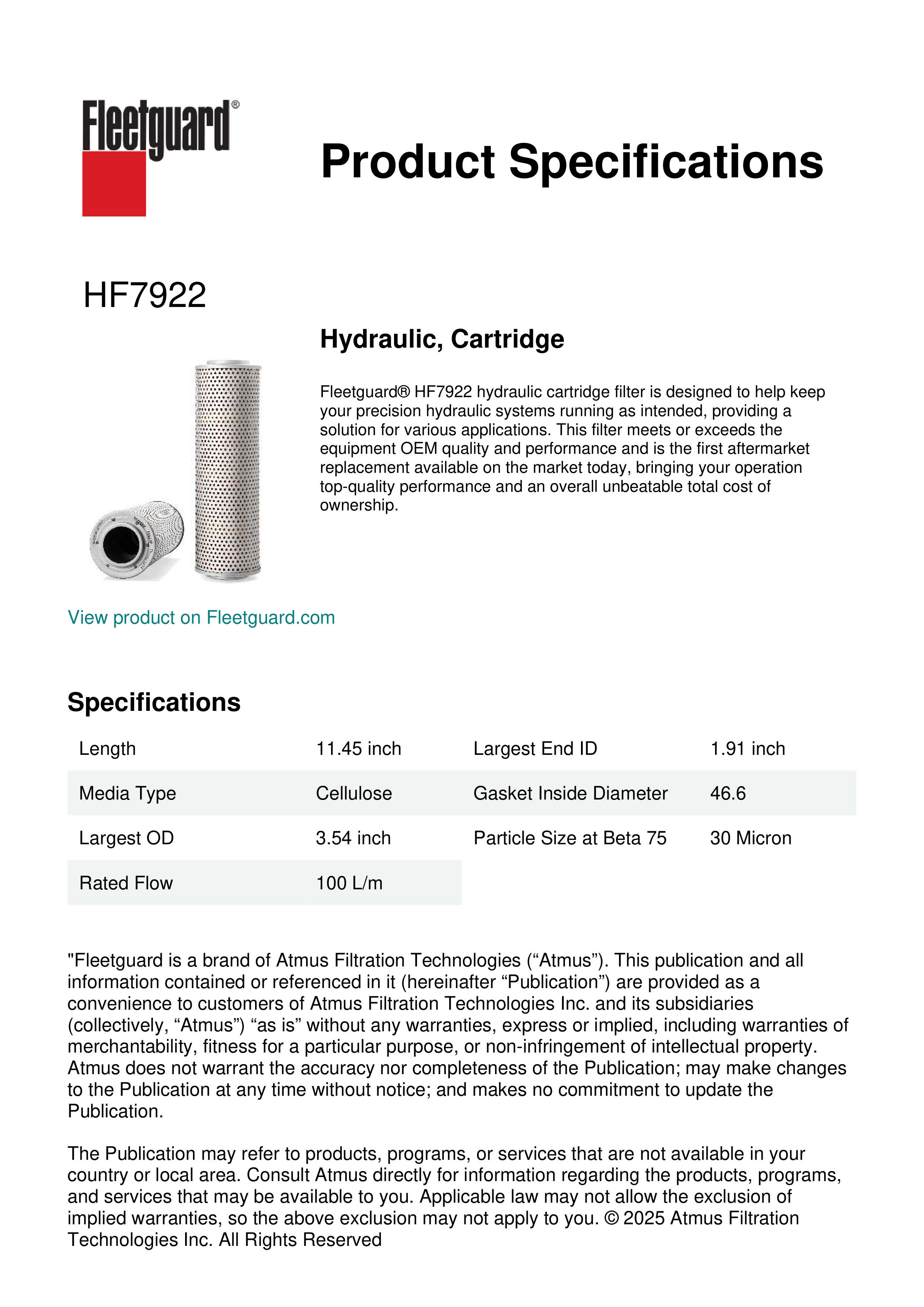 Fleetguard® HF7922 hydraulic cartridge filter is designed to help keep your precision hydraulic systems running as intended, providing a solution for various applications. This filter meets or exceeds the equipment OEM quality and performance and is the first aftermarket replacement available on the market today, bringing your operation top-quality performance and an overall unbeatable total cost of ownership.Specification
