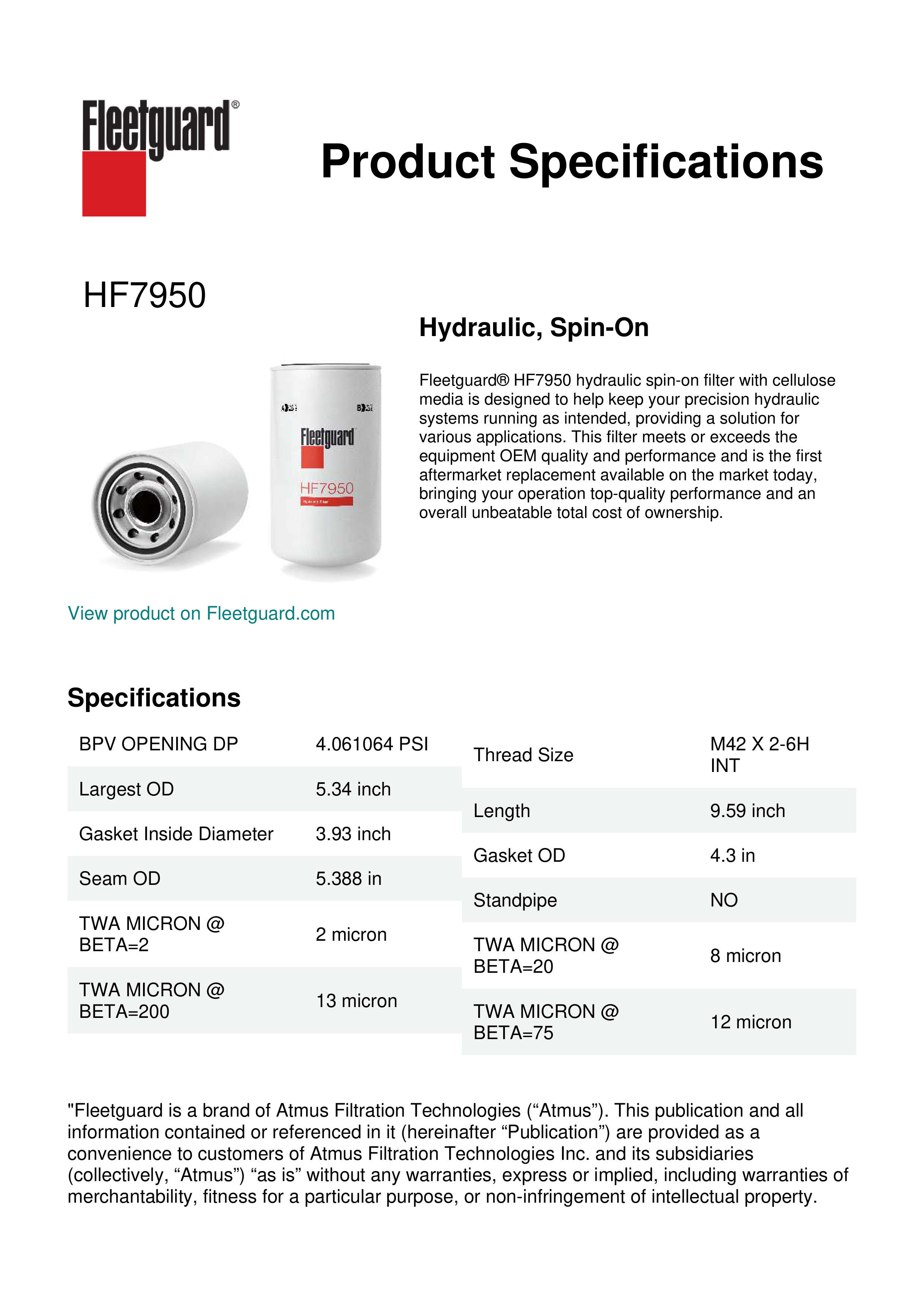 Fleetguard® HF7950 hydraulic spin-on filter with cellulose media is designed to help keep your precision hydraulic systems running as intended, providing a solution for various applications. This filter meets or exceeds the equipment OEM quality and performance and is the first aftermarket replacement available on the market today, bringing your operation top-quality performance and an overall unbeatable total cost of ownership.Specification