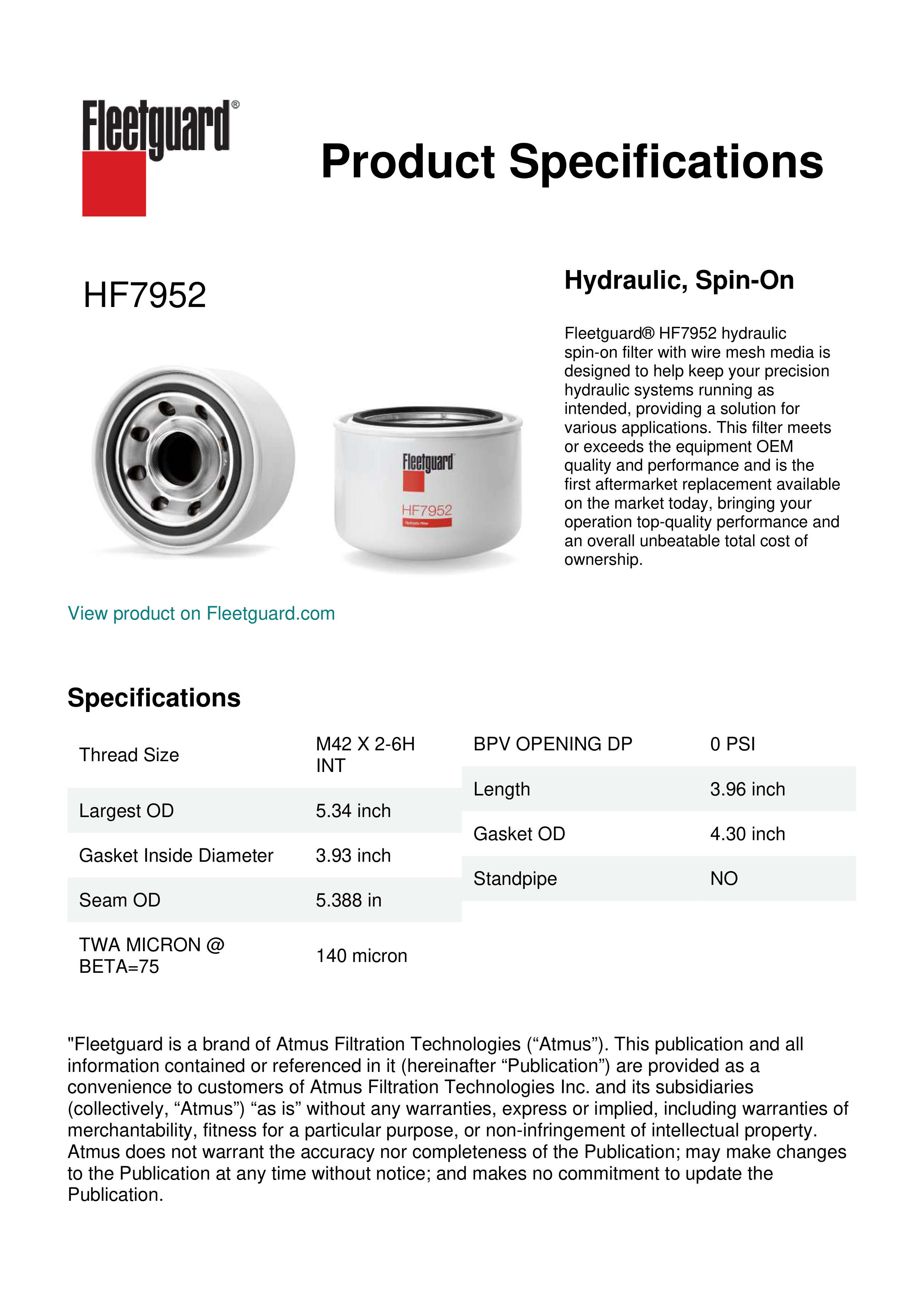 Fleetguard® HF7952 hydraulic spin-on filter with wire mesh media is designed to help keep your precision hydraulic systems running as intended, providing a solution for various applications. This filter meets or exceeds the equipment OEM quality and performance and is the first aftermarket replacement available on the market today, bringing your operation top-quality performance and an overall unbeatable total cost of ownership.Specification