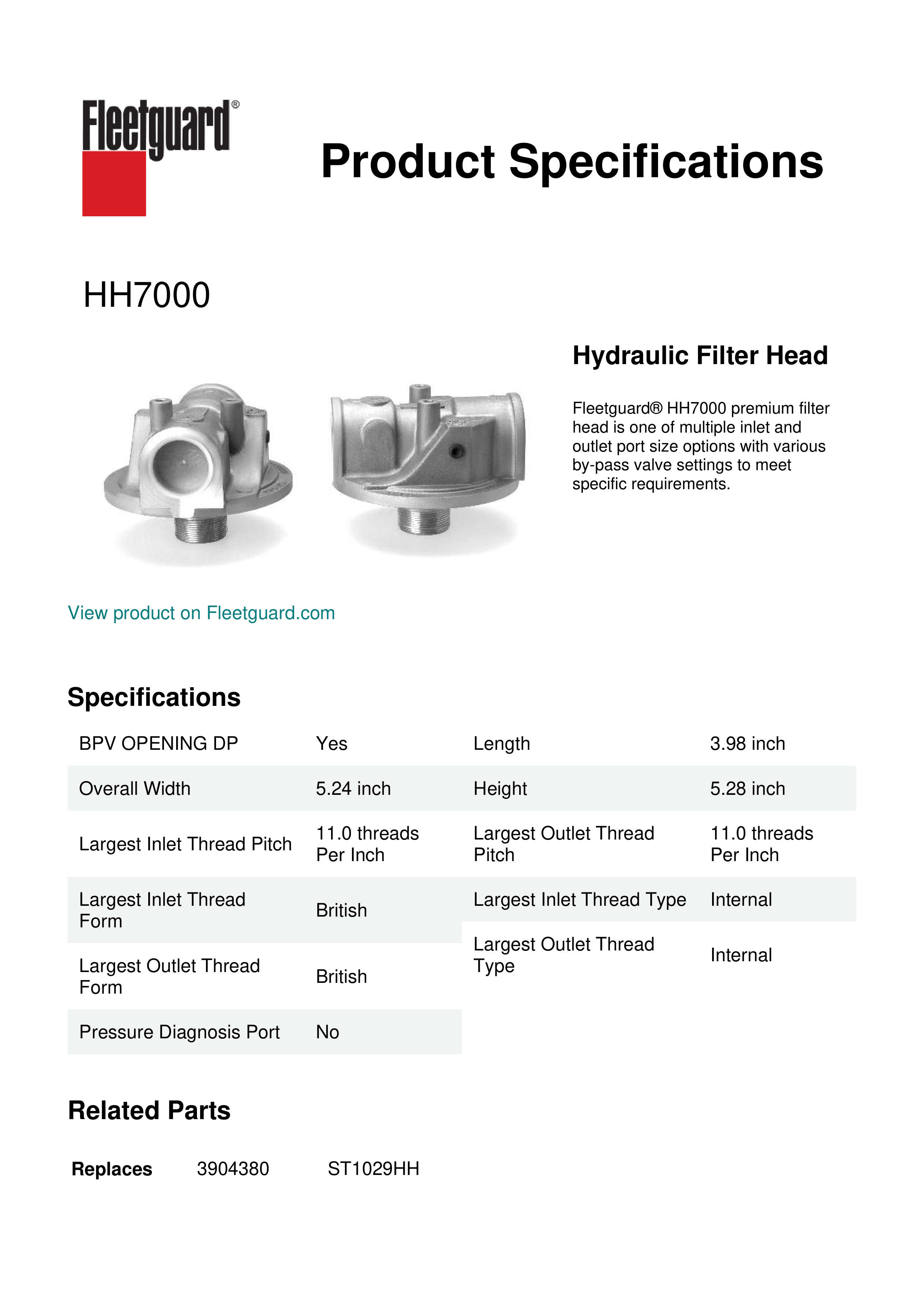 Fleetguard® HH7000 premium filter head is one of multiple inlet and outlet port size options with various by-pass valve settings to meet specific requirements.Specification