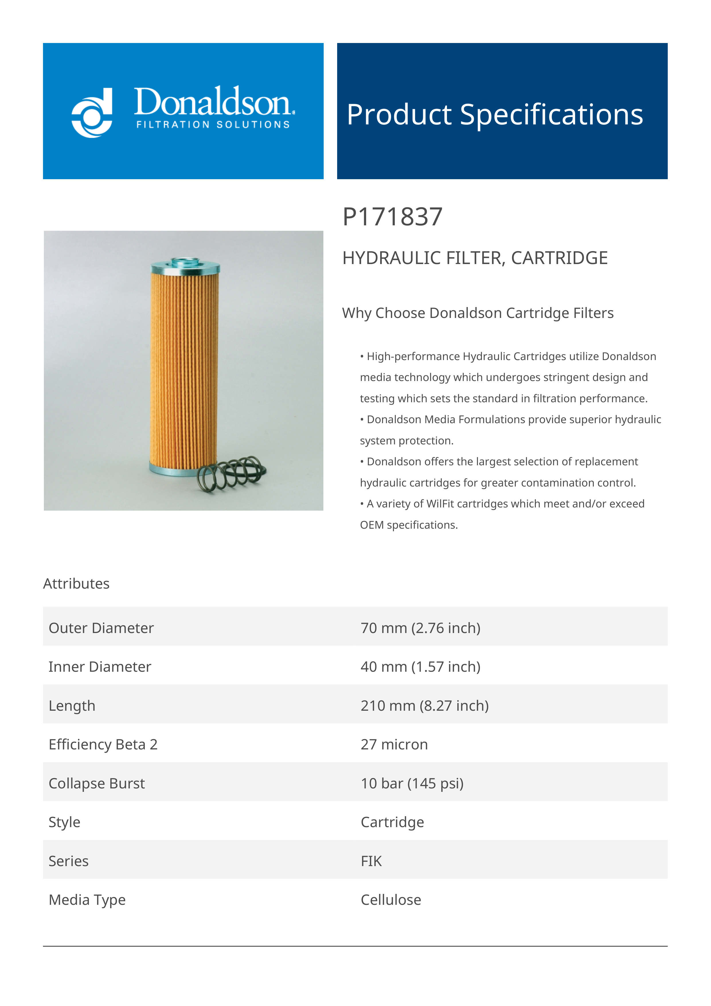 Genuine Donaldson P171837 Hydraulic Filter, Cartridge is designed to provide superior protection for your hydraulic system, effectively capturing contaminants to ensure clean fluid circulation. With high-quality filtration media, it extends equipment life, improves operational efficiency, and maintains fluid cleanliness even in the most demanding environments.
