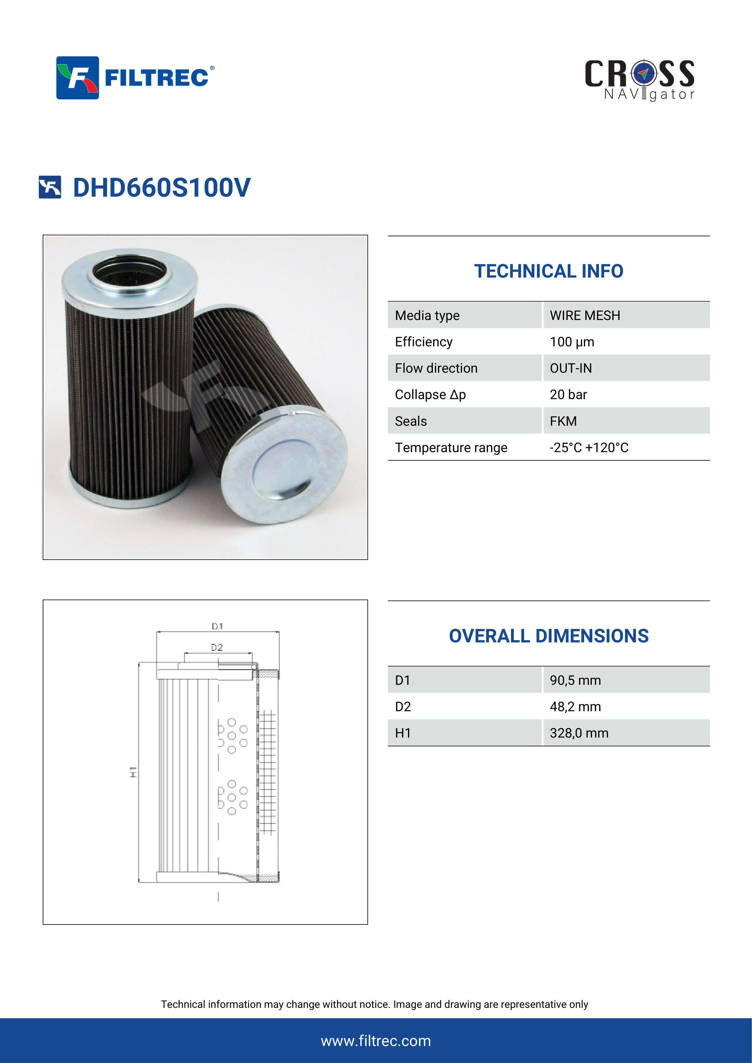 Genuine Filtrec DHD660S100V. This Filtrec element is designed to meet or exceed the quality and performance of brand OEM’s ensuring superior filtration performance and long-lasting durability.
