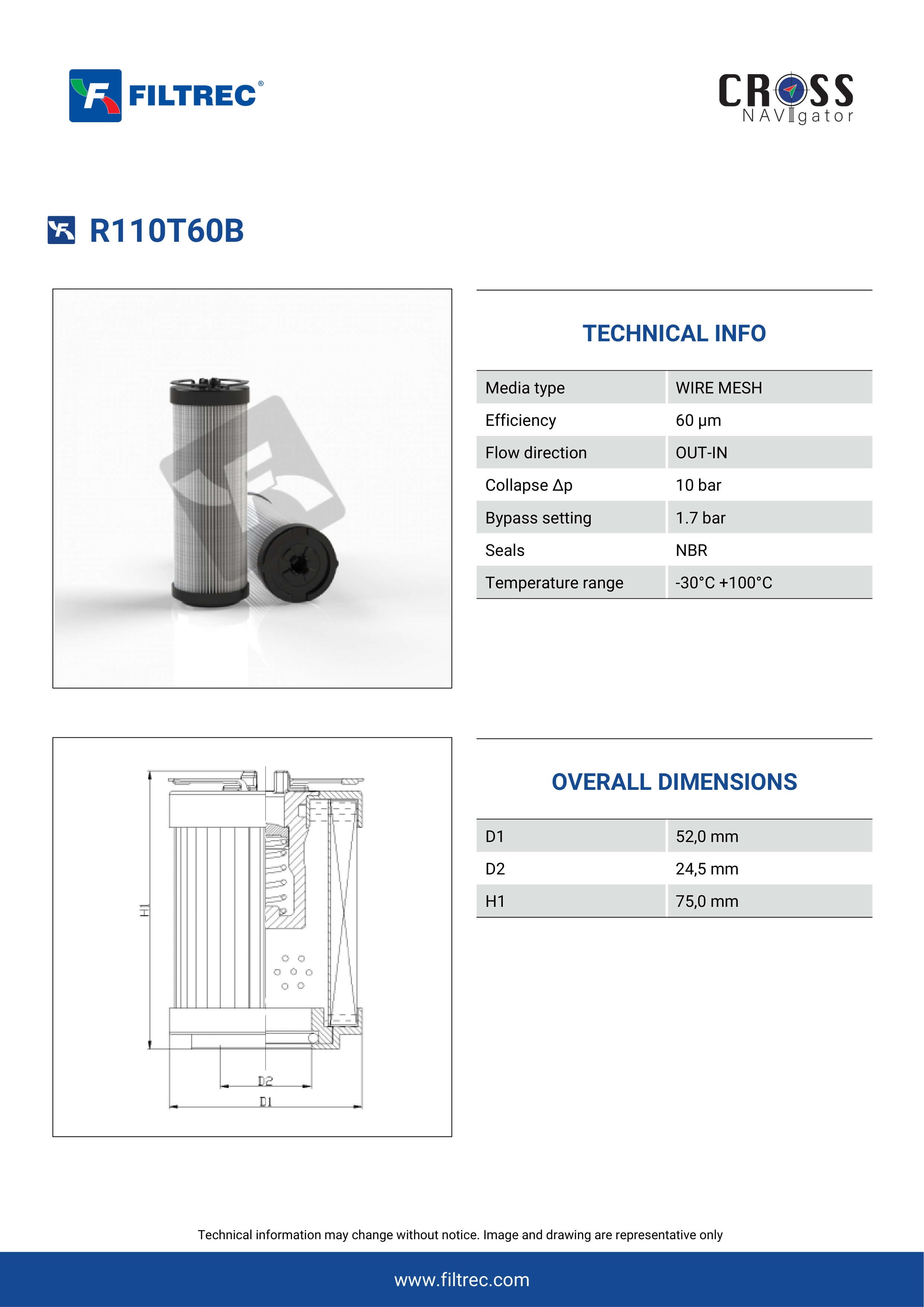 Genuine Filtrec R110T60B. This Filtrec element is designed to meet or exceed the quality and performance of brand OEM’s ensuring superior filtration performance and long-lasting durability.