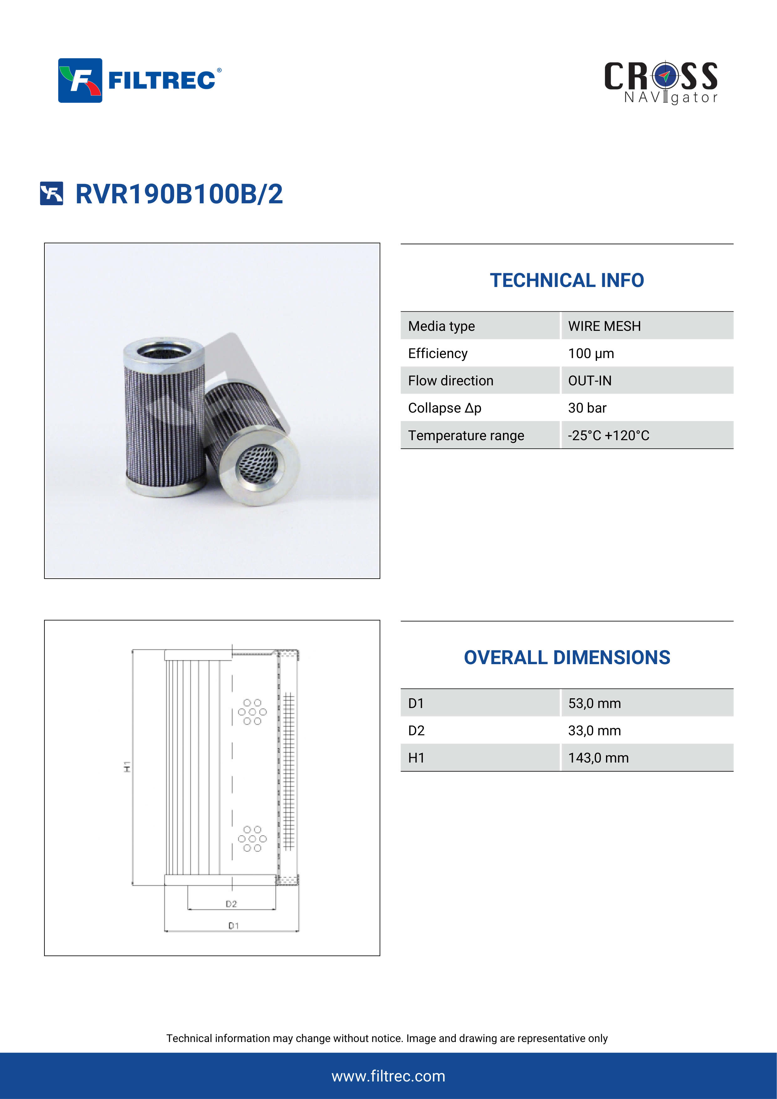 Genuine Filtrec RVR190B100B/2. This Filtrec element is designed to meet or exceed the quality and performance of brand OEM’s ensuring superior filtration performance and long-lasting durability.