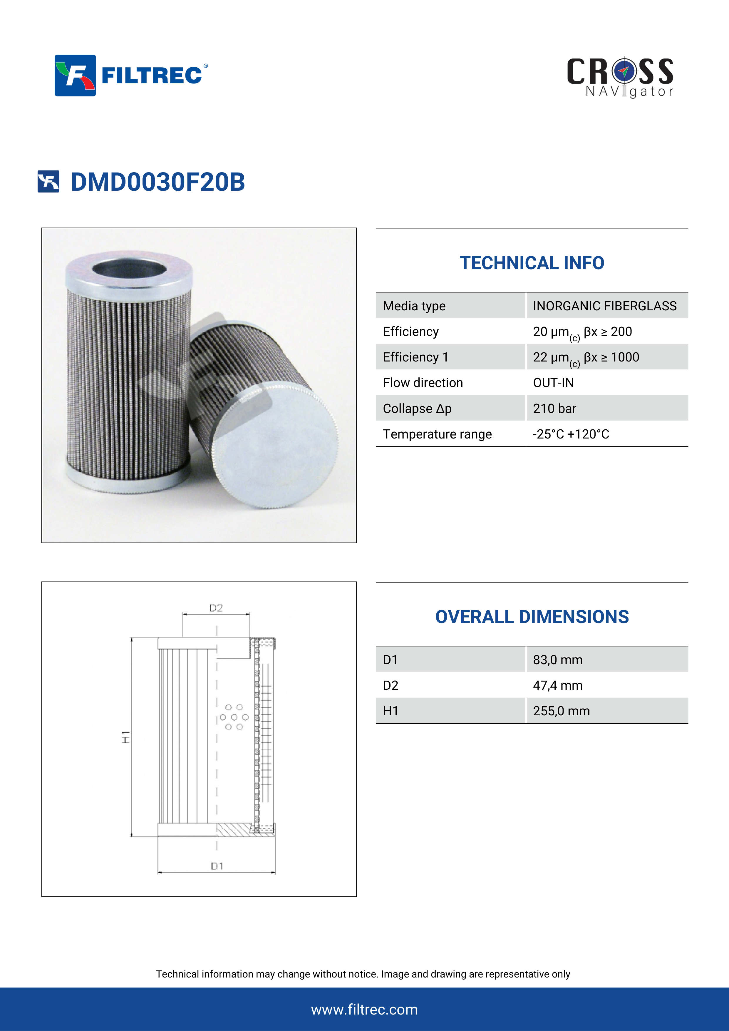Genuine Filtrec DMD0030F20B. This Filtrec element is designed to meet or exceed the quality and performance of brand OEM’s ensuring superior filtration performance and long-lasting durability.Engineered with their high performance media and a durable design, the DMD0030F20B provides reliable and consistent performance over its lifespan, even in harsh operating environments. When you order from FilterFinder, you can trust that you are getting a reliable and high-quality replacement filter that will keep your system running smoothly.
