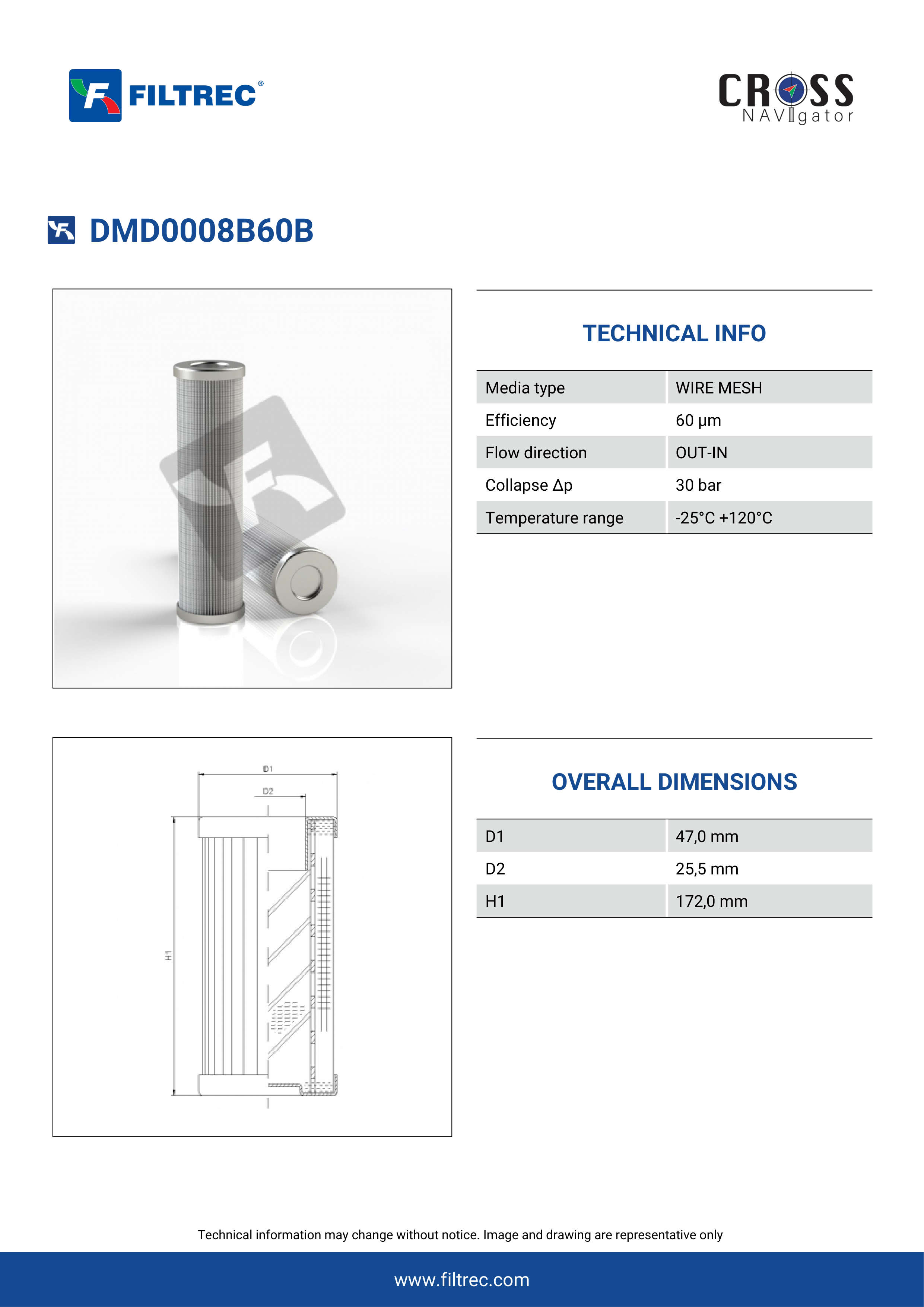 The efficiency of the element is shown using the Micron (µ) and Beta (β) ratings. The micron rating indicates the size of the particle being filtered and the beta rating the efficiency, calculated as 1/β.
