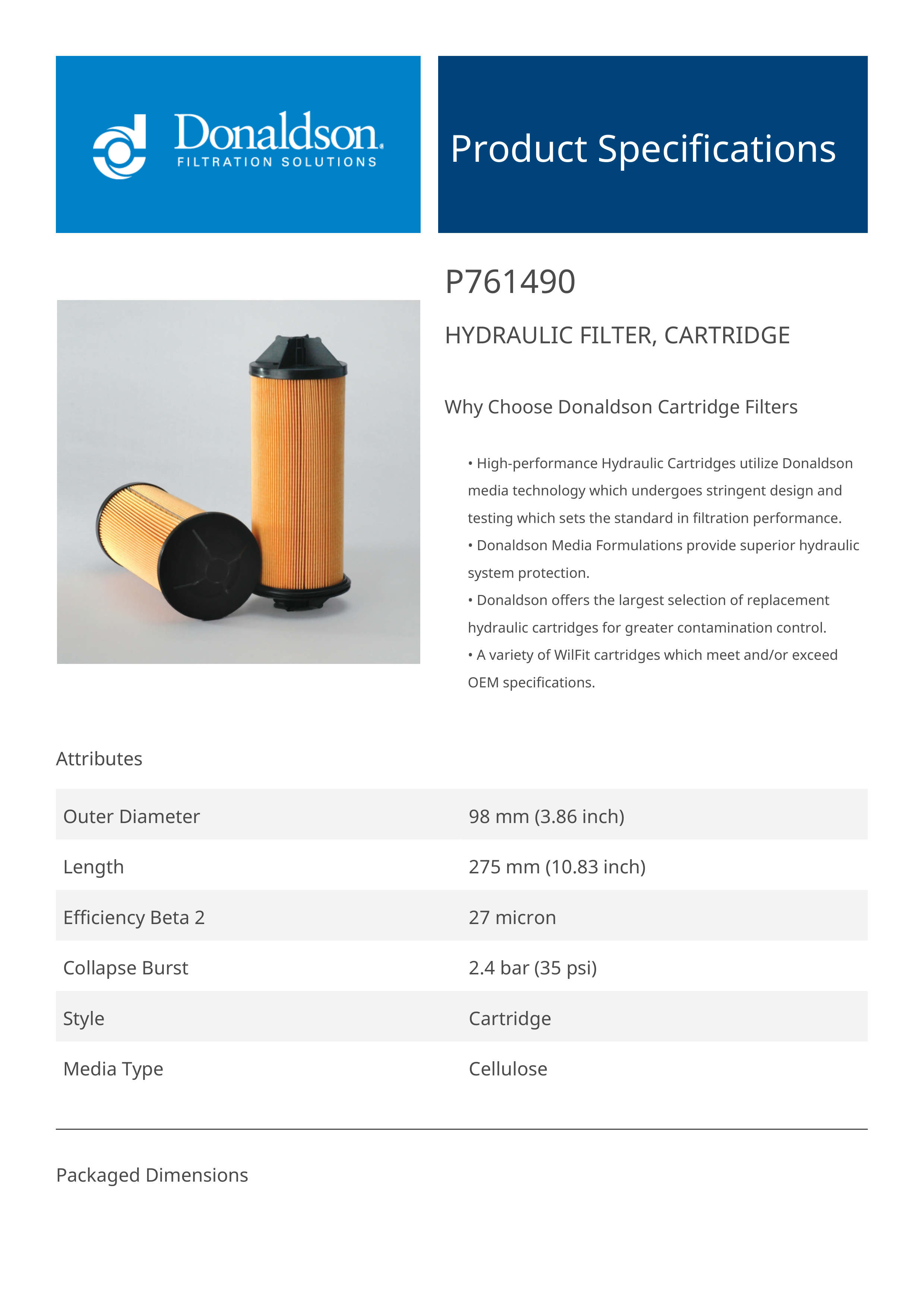 Genuine Donaldson P761490 Hydraulic Filter, Cartridge is designed to provide superior protection for your hydraulic system, effectively capturing contaminants to ensure clean fluid circulation. With high-quality filtration media, it extends equipment life, improves operational efficiency, and maintains fluid cleanliness even in the most demanding environments.