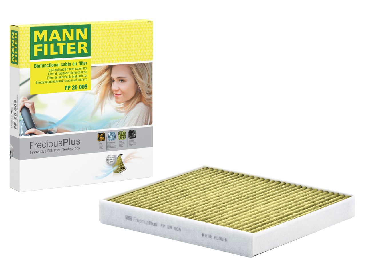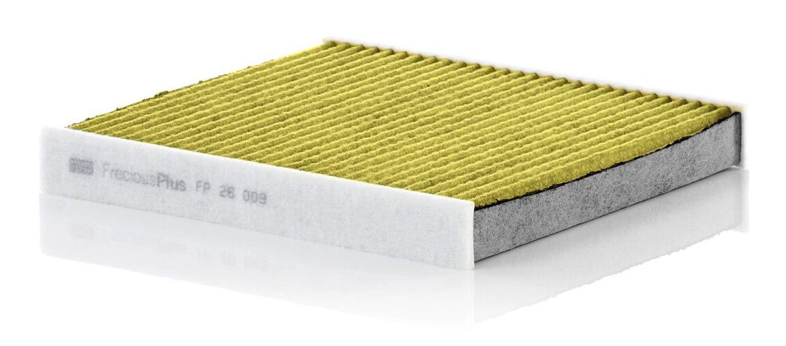 Biofunctional MANN-FILTER FreciousPlus cabin air filters - nearly 100% protection against nitrogen oxides, dust, allergens and mould - harmful gases and unpleasant odours are also eliminated and virus aerosols filtered. The three-layer filter technology absorbs almost 100% of allergens, reduces the growth of molds and bacteria by more than 98% and stops fine dust almost completely.Specification