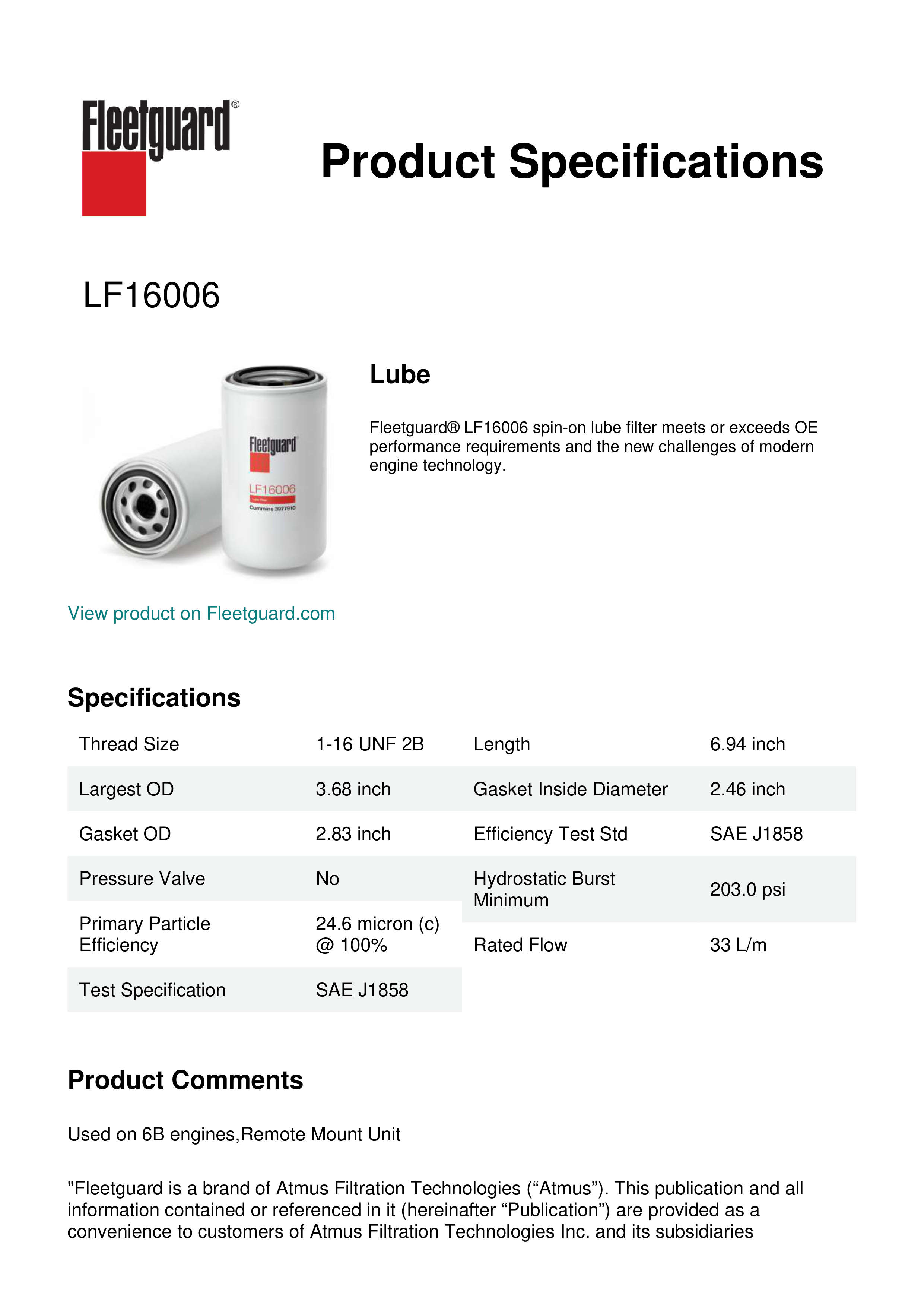 Fleetguard® LF16006 spin-on lube filter meets or exceeds OE performance requirements and the new challenges of modern engine technology.Specification