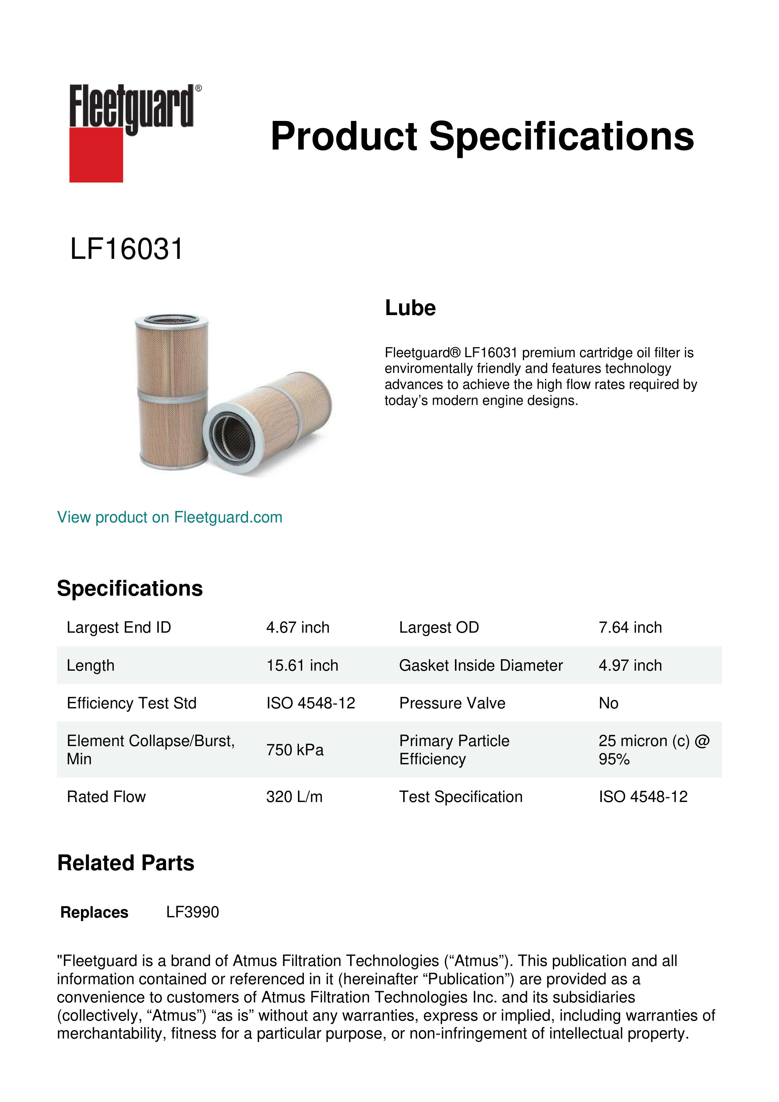 Fleetguard® LF16031 premium cartridge oil filter is enviromentally friendly and features technology advances to achieve the high flow rates required by today’s modern engine designs.Specification