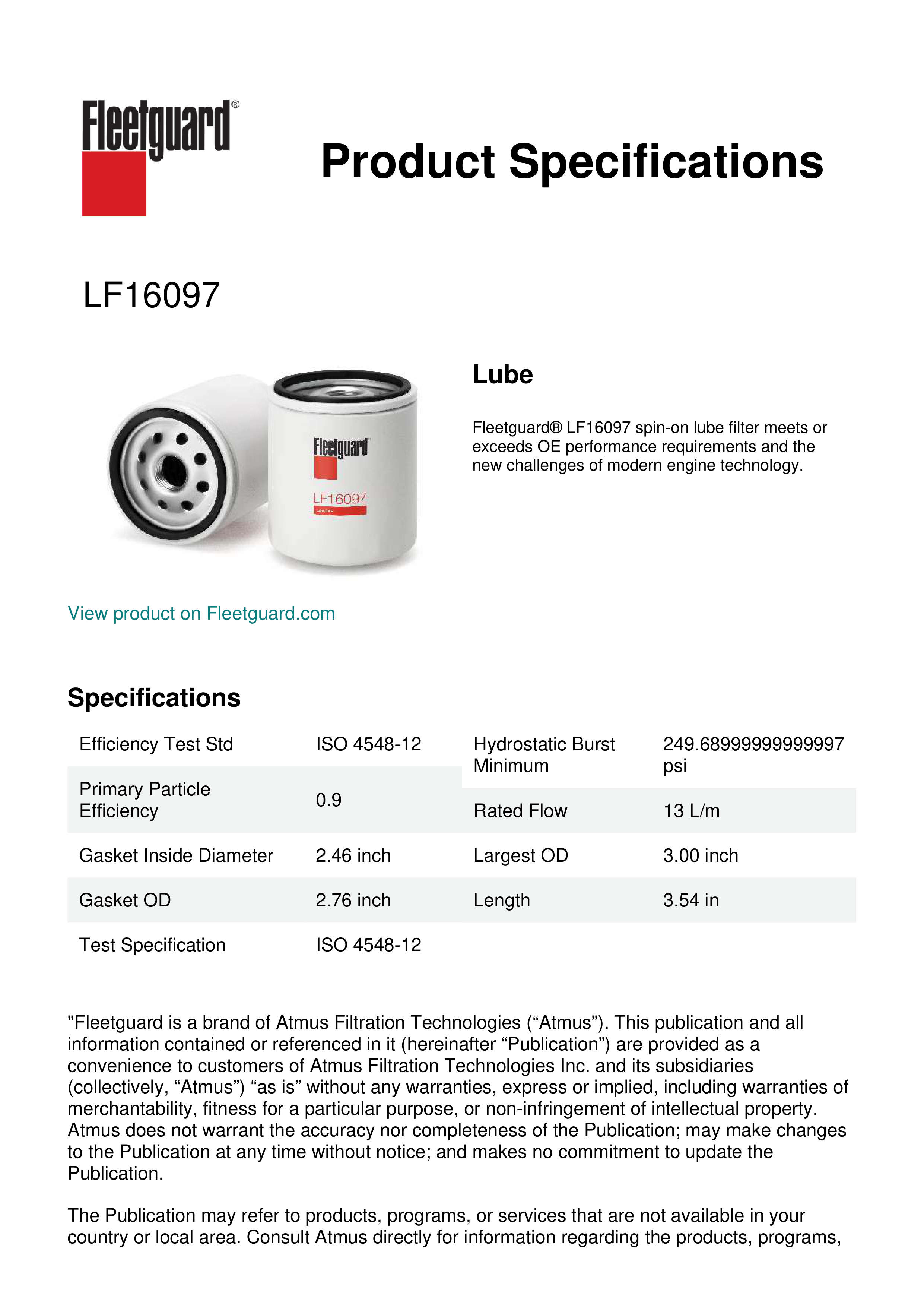 Fleetguard® LF16097 spin-on lube filter meets or exceeds OE performance requirements and the new challenges of modern engine technology.Specification