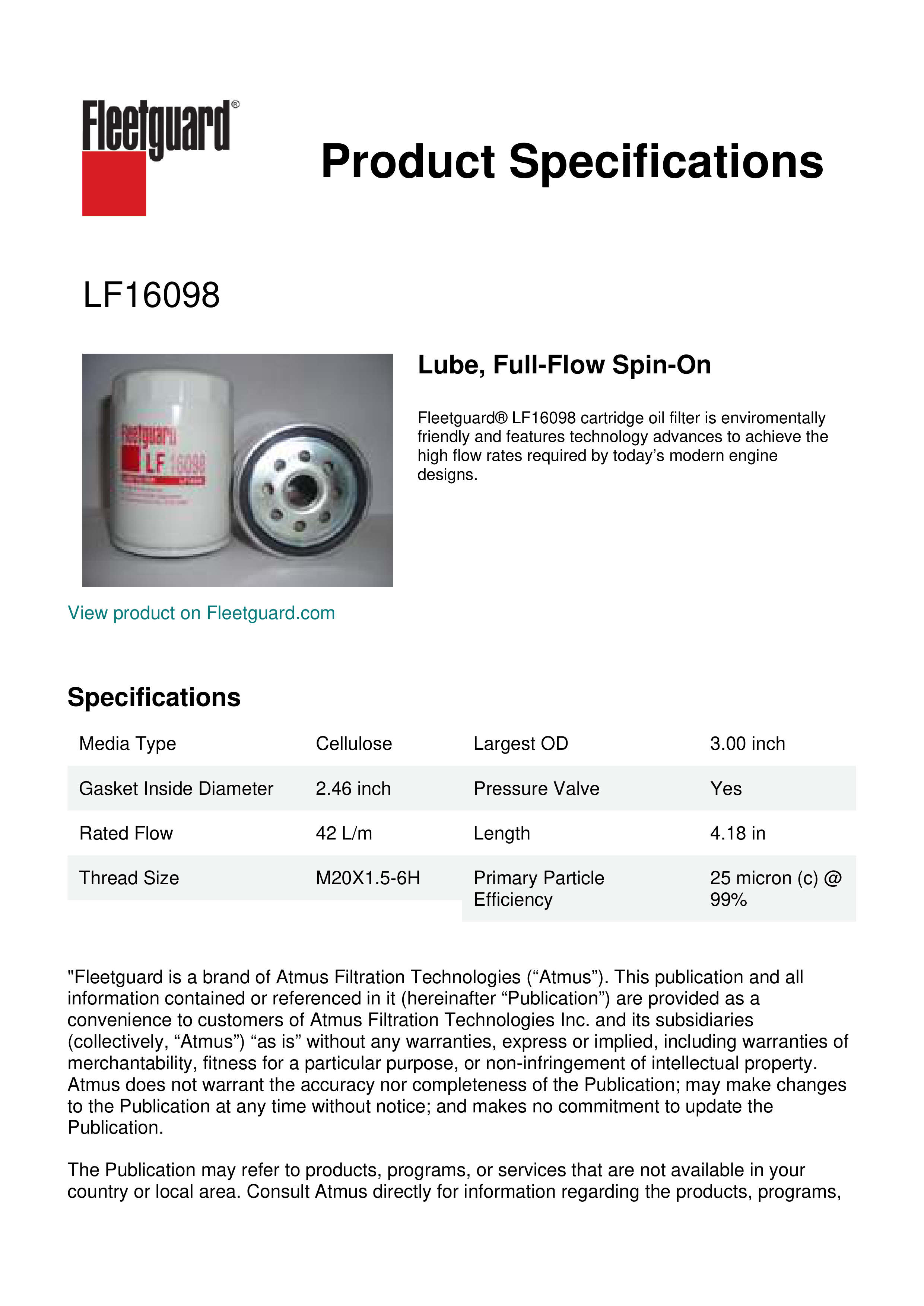 Fleetguard® LF16098 cartridge oil filter is enviromentally friendly and features technology advances to achieve the high flow rates required by today’s modern engine designs.Specification