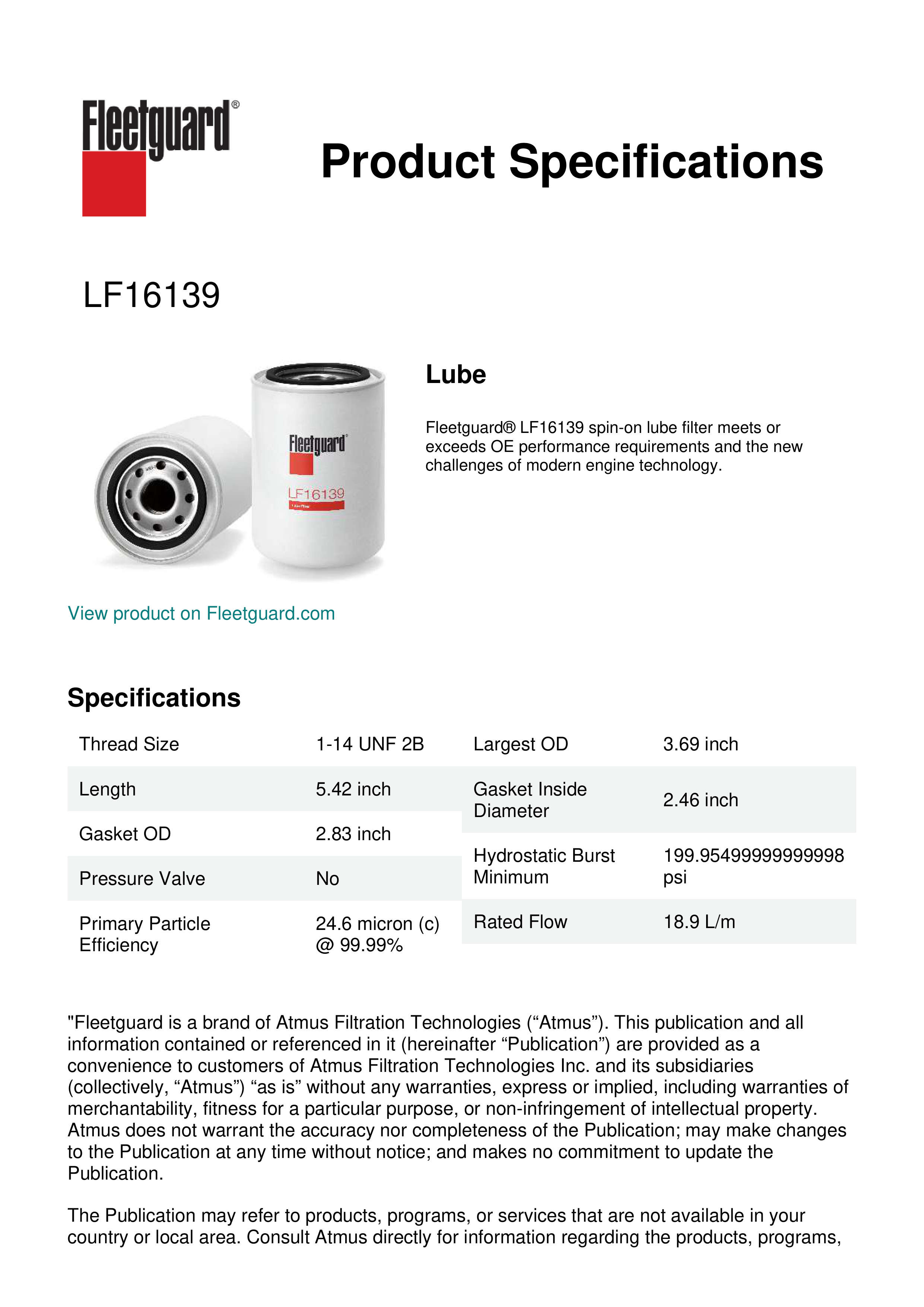 Fleetguard® LF16139 spin-on lube filter meets or exceeds OE performance requirements and the new challenges of modern engine technology.Specification