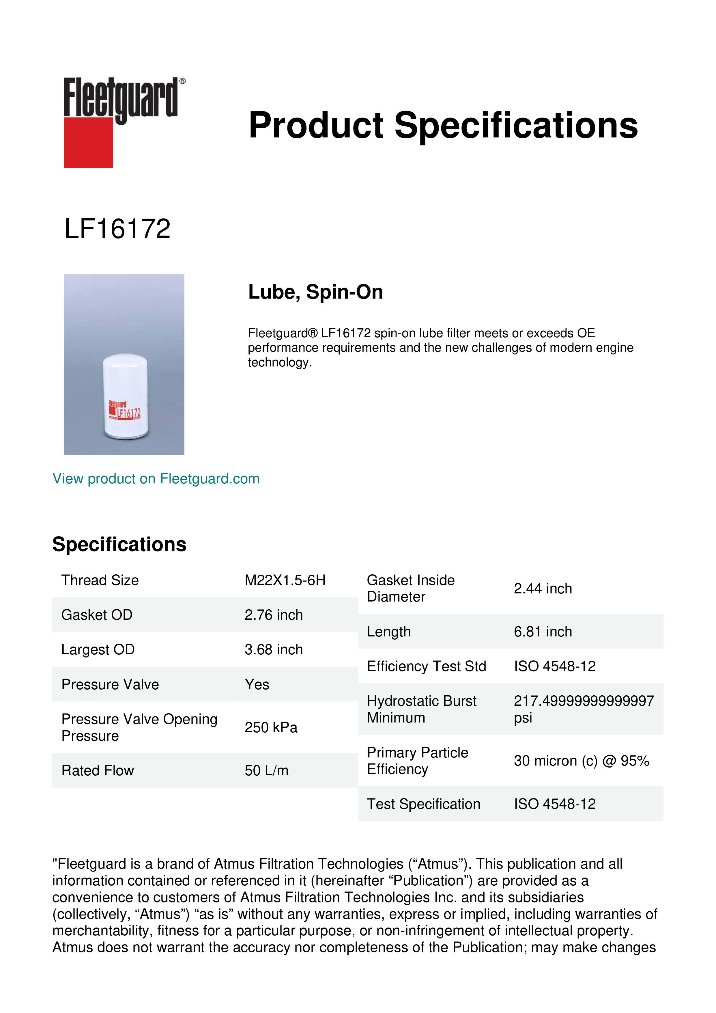 Fleetguard® LF16172 spin-on lube filter meets or exceeds OE performance requirements and the new challenges of modern engine technology.Specification