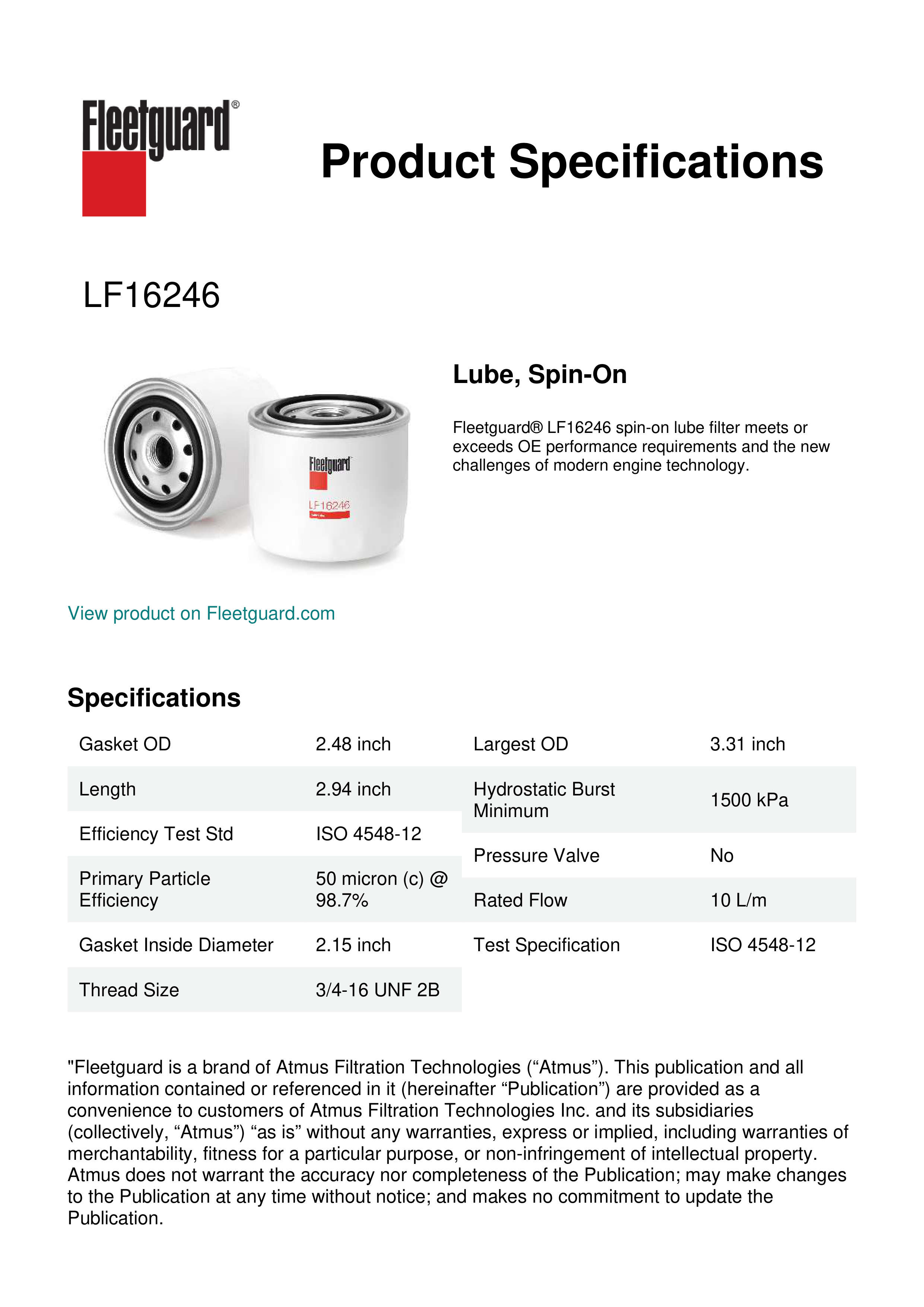 Fleetguard® LF16246 spin-on lube filter meets or exceeds OE performance requirements and the new challenges of modern engine technology.Specification