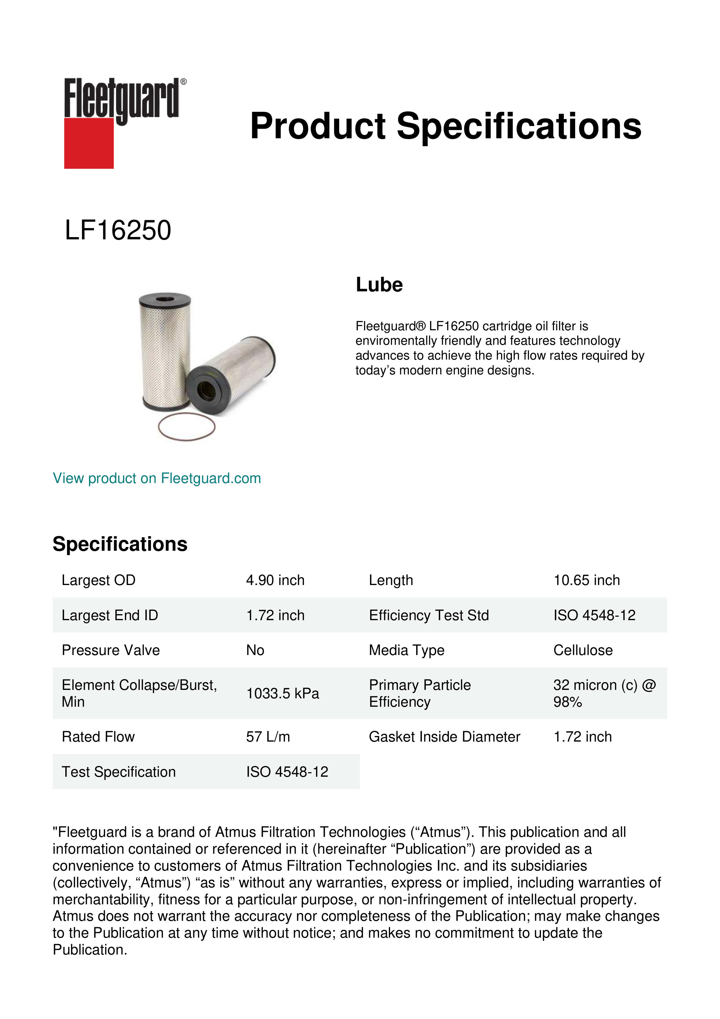 Fleetguard® LF16250 cartridge oil filter is enviromentally friendly and features technology advances to achieve the high flow rates required by today’s modern engine designs.Specification