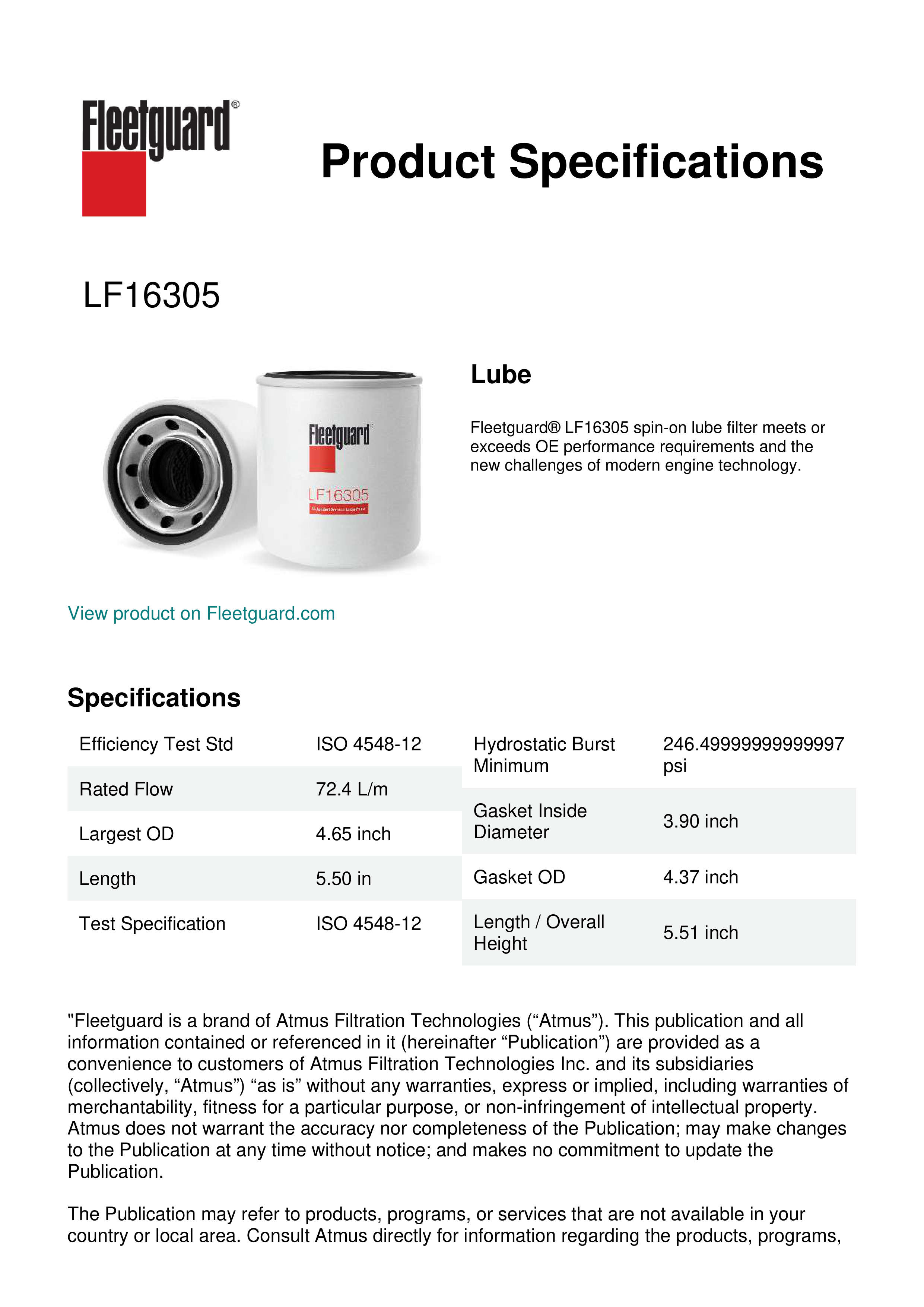 Fleetguard® LF16305 spin-on lube filter meets or exceeds OE performance requirements and the new challenges of modern engine technology.Specification