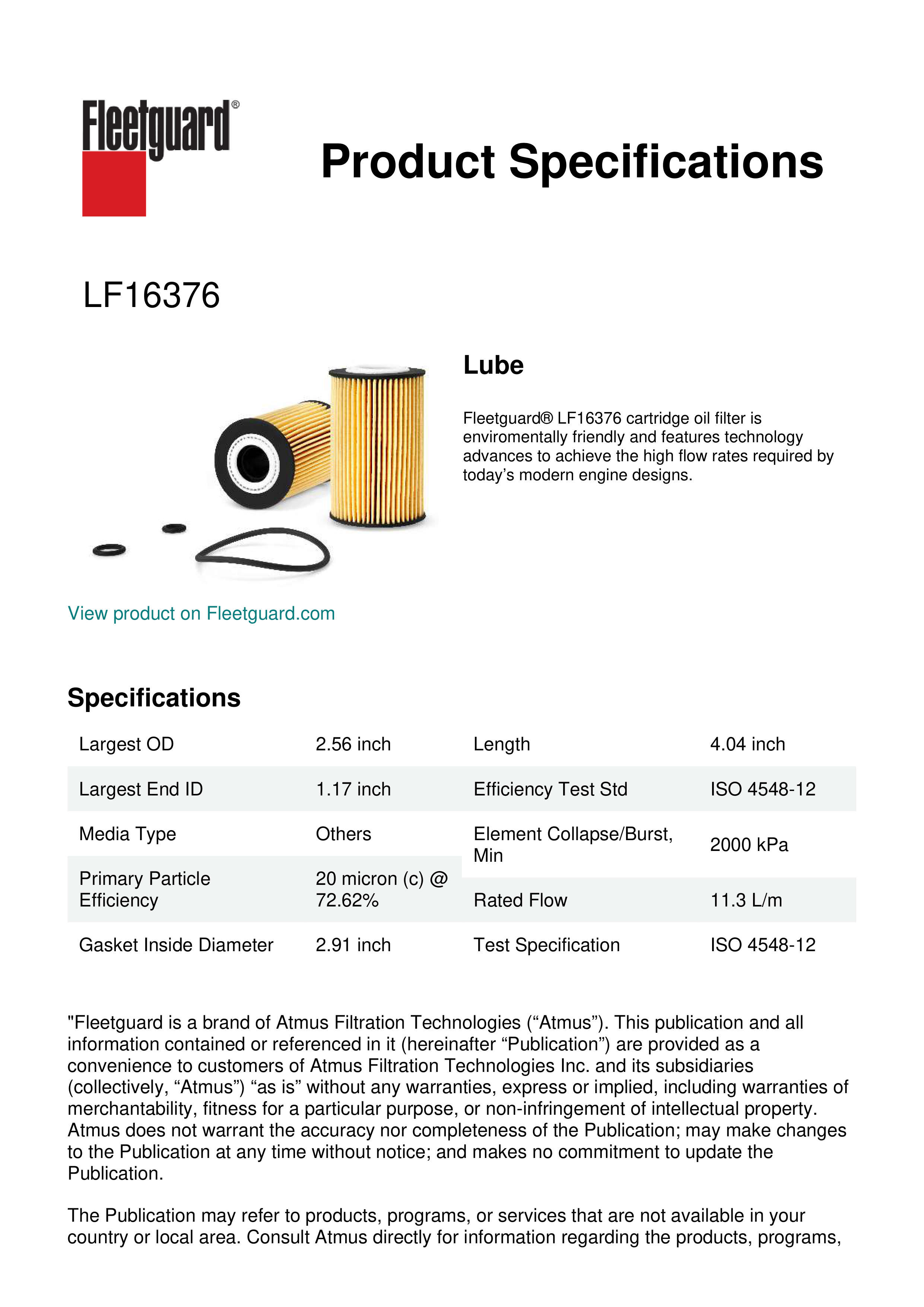 Fleetguard® LF16376 cartridge oil filter is enviromentally friendly and features technology advances to achieve the high flow rates required by today’s modern engine designs.Specification