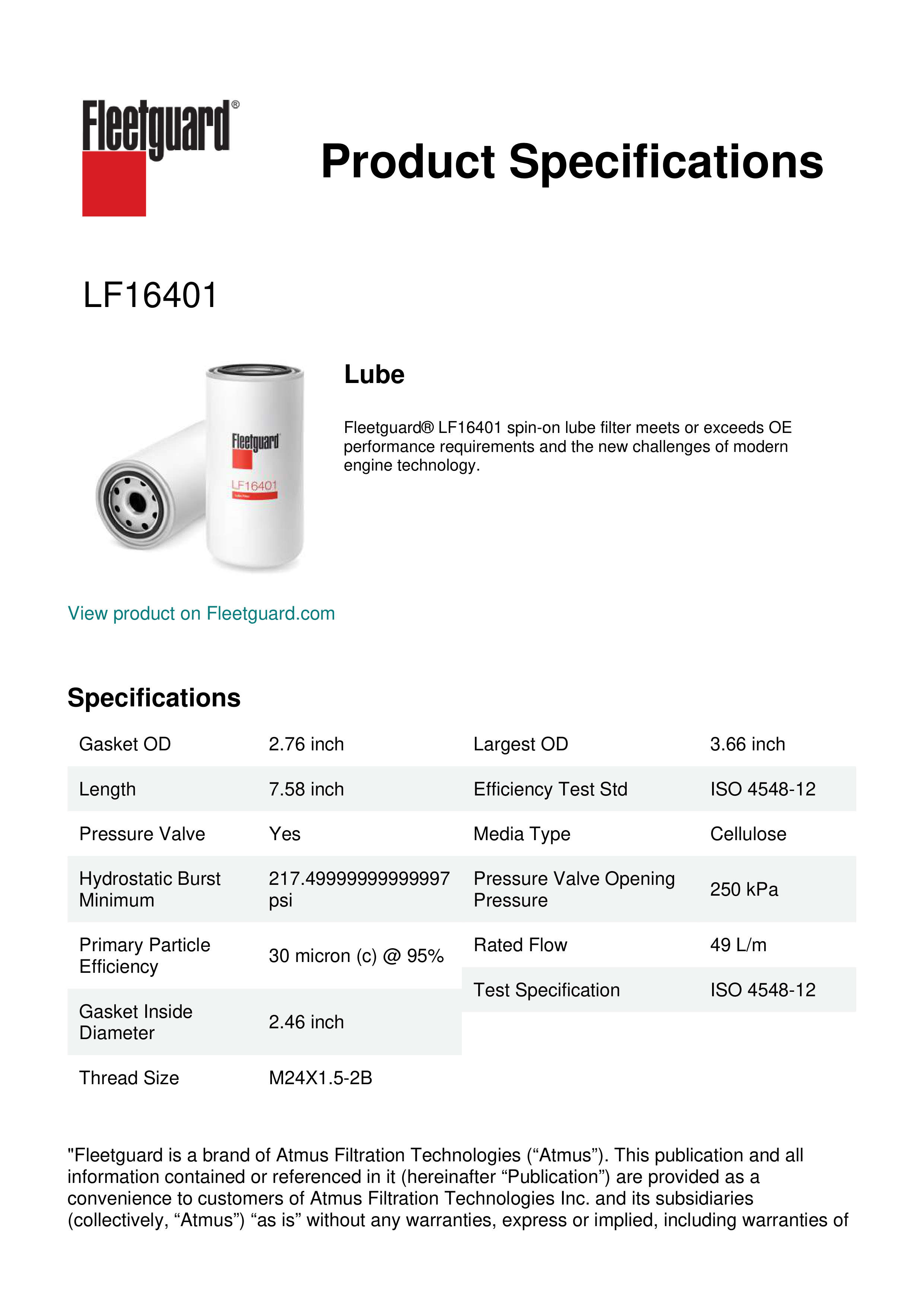 Fleetguard® LF16401 spin-on lube filter meets or exceeds OE performance requirements and the new challenges of modern engine technology.Specification