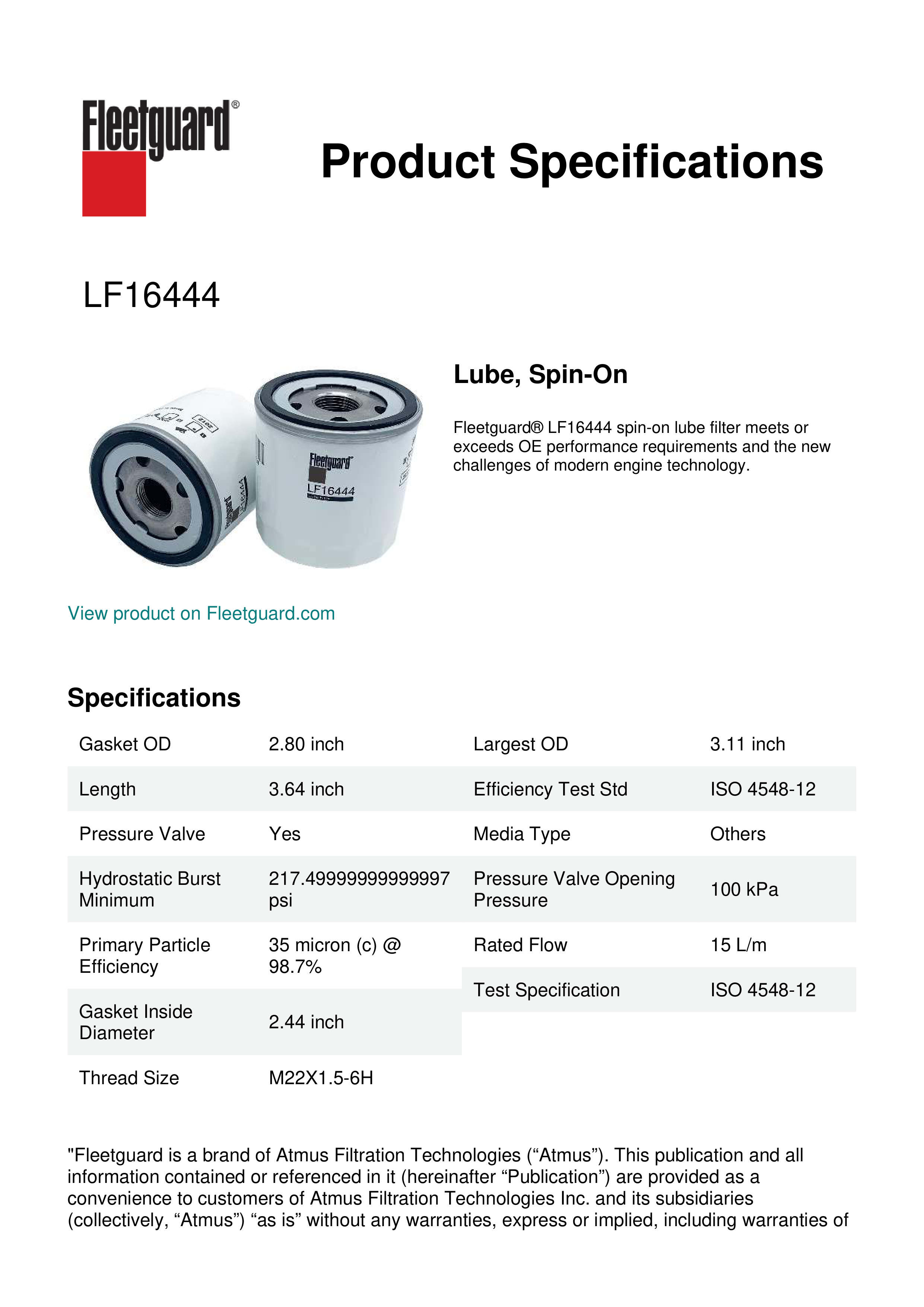 Fleetguard® LF16444 spin-on lube filter meets or exceeds OE performance requirements and the new challenges of modern engine technology.Specification