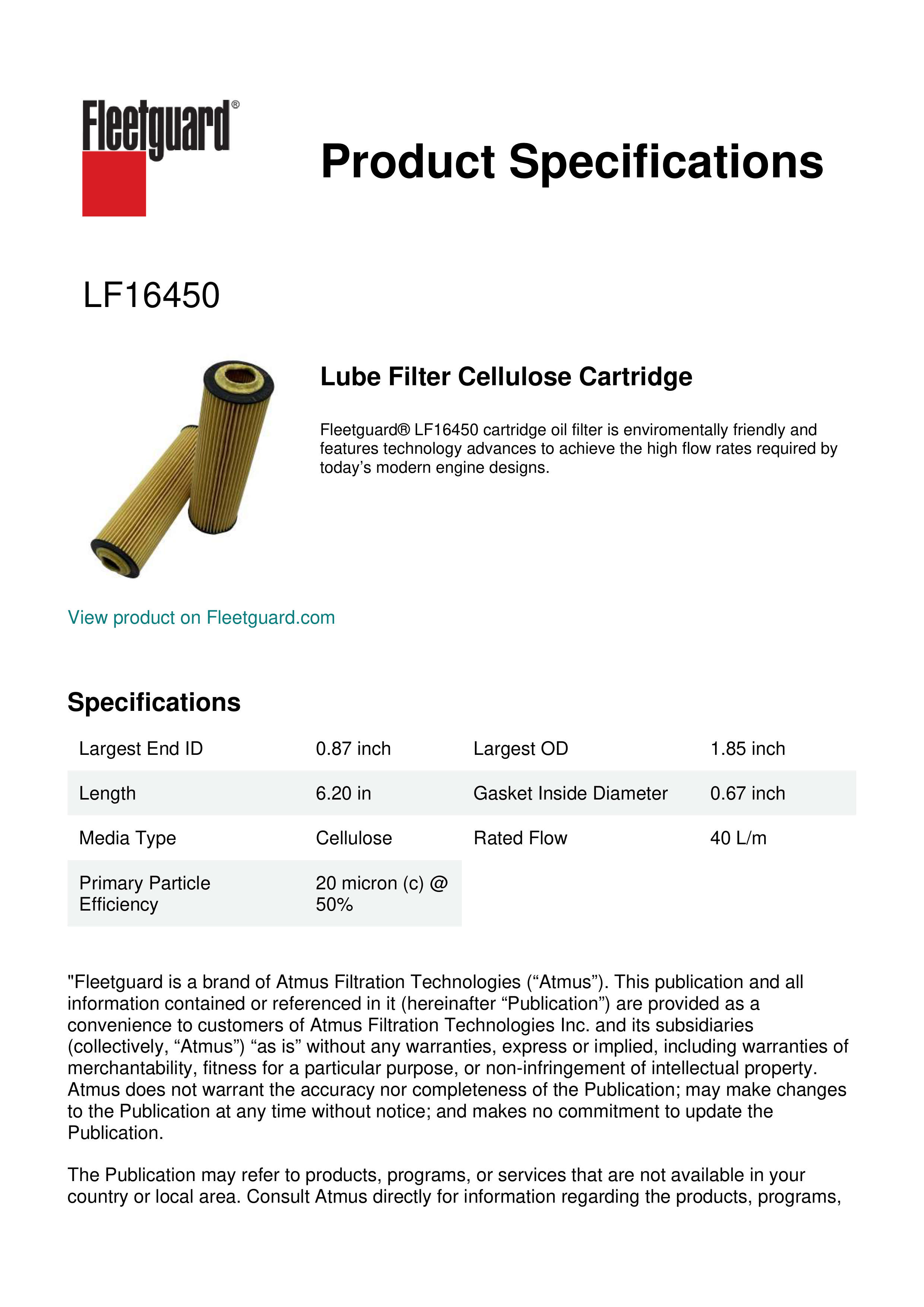 Fleetguard® LF16450 cartridge oil filter is enviromentally friendly and features technology advances to achieve the high flow rates required by today’s modern engine designs.Specification
