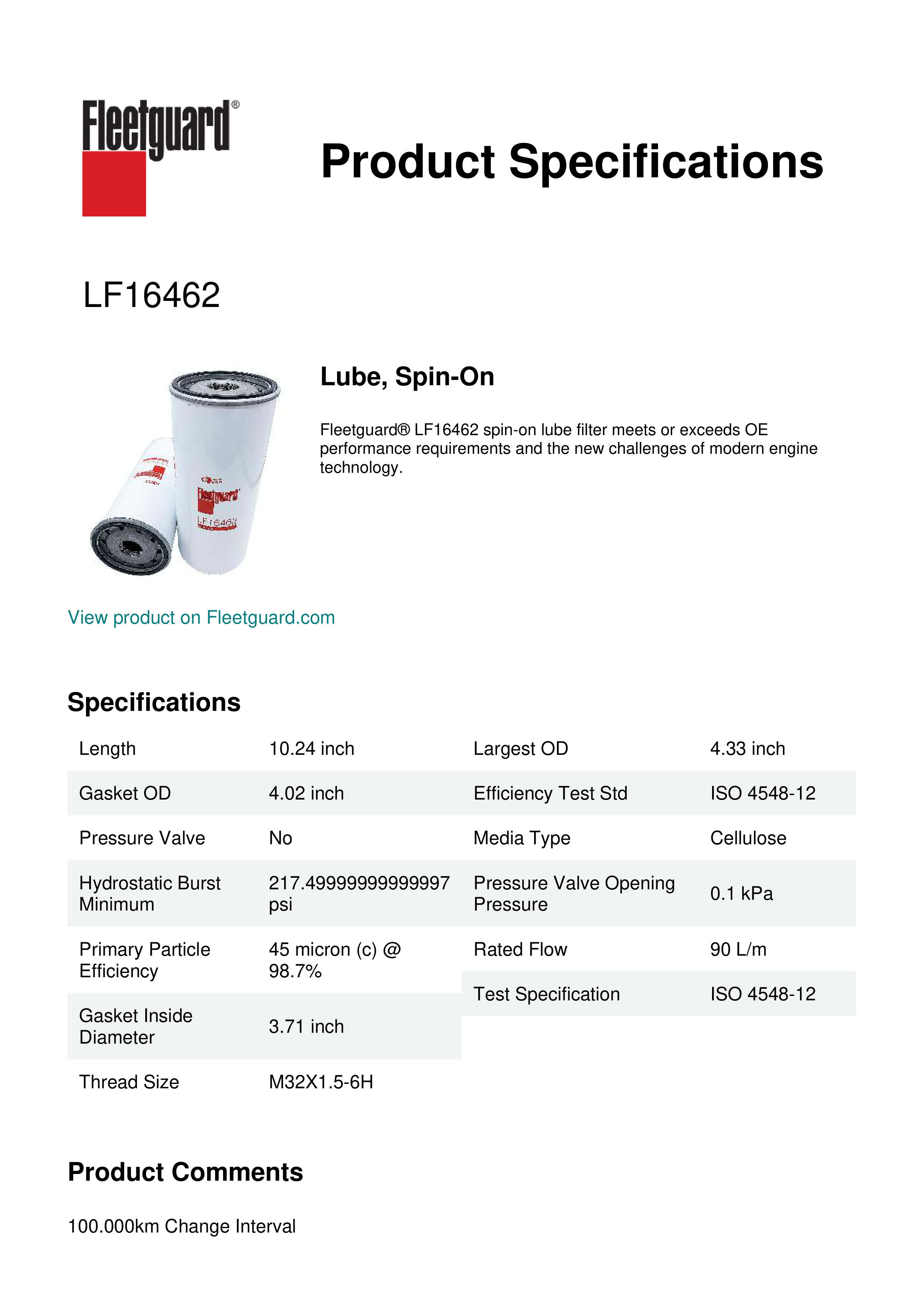 Fleetguard® LF16462 spin-on lube filter meets or exceeds OE performance requirements and the new challenges of modern engine technology.Specification