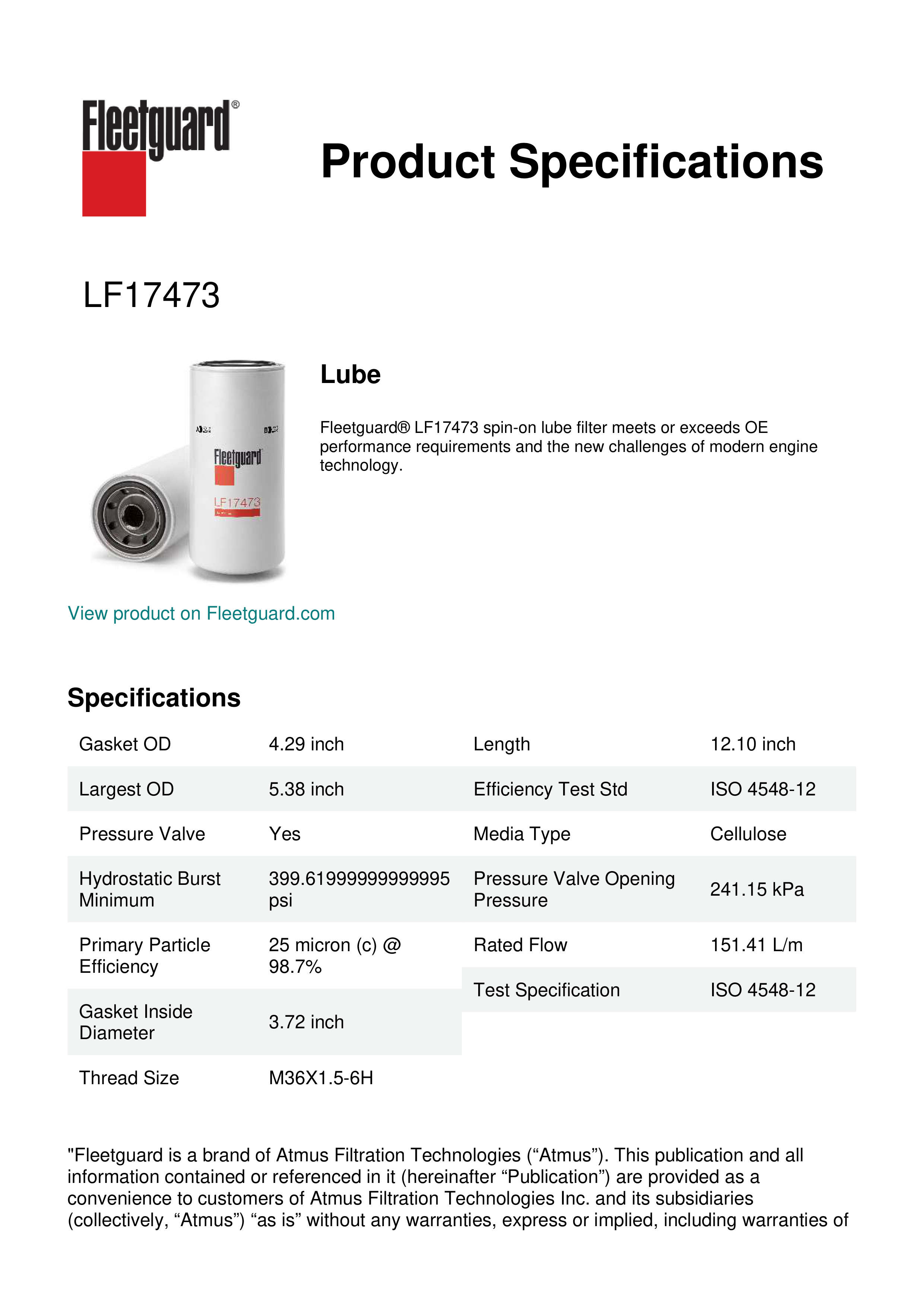 Fleetguard® LF17473 spin-on lube filter meets or exceeds OE performance requirements and the new challenges of modern engine technology.Specification