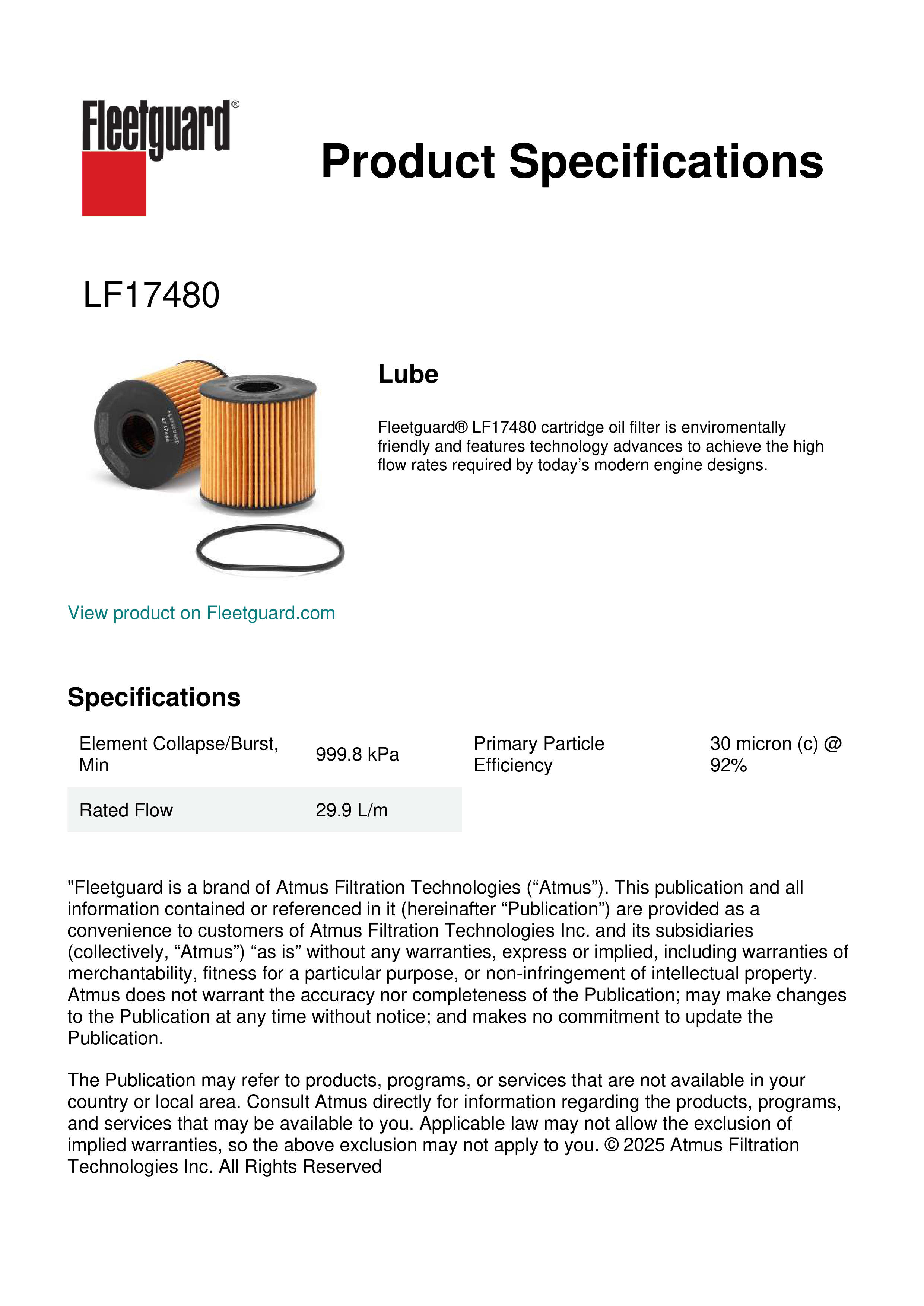 Fleetguard® LF17480 cartridge oil filter is enviromentally friendly and features technology advances to achieve the high flow rates required by today’s modern engine designs.Specification